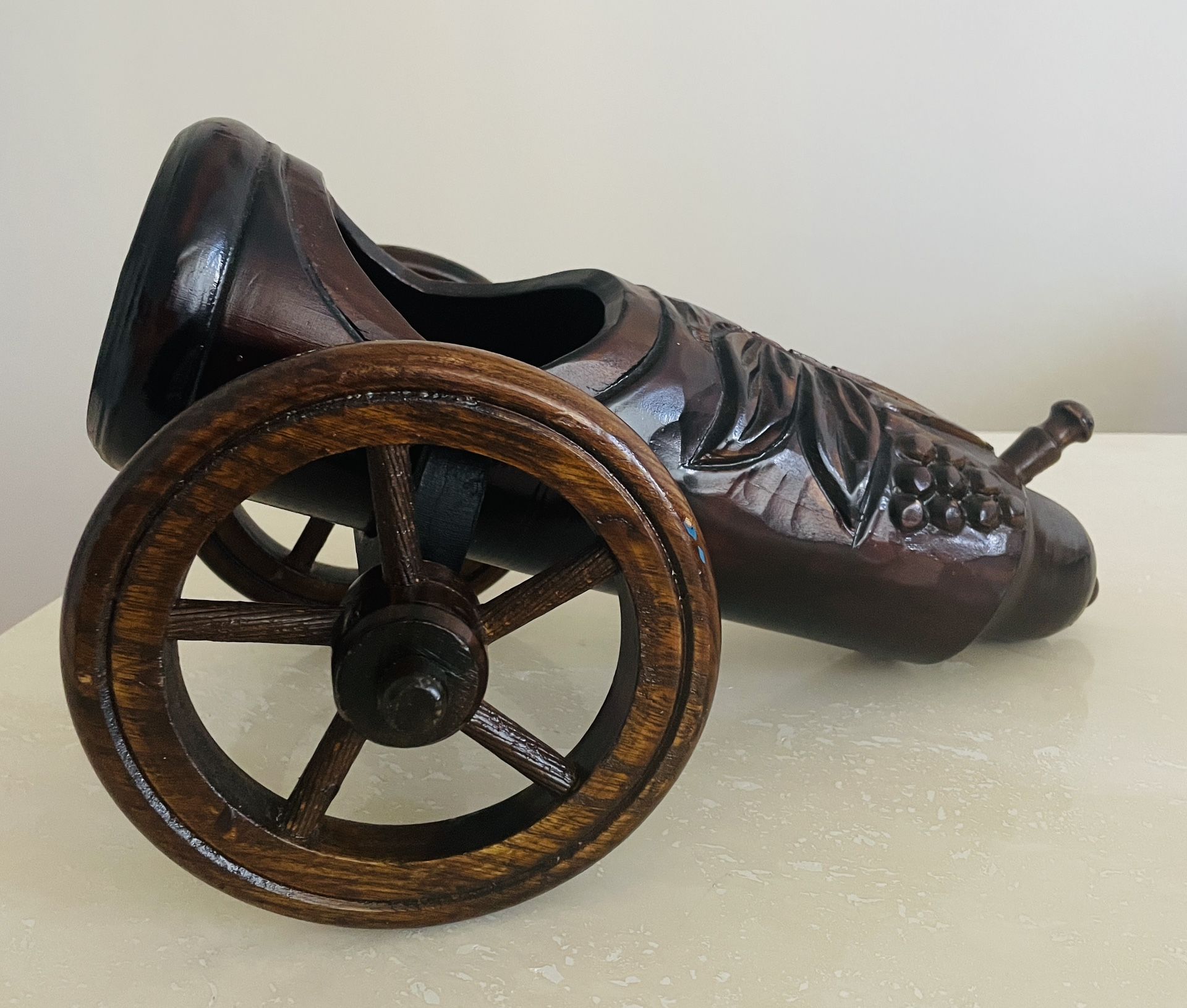 Vintage Hand Made Carved Brown Wood Cannon Wine Bottle Holder One of a Kind Purchased in Romania Transylvania Pick up: Fort Lauderdale