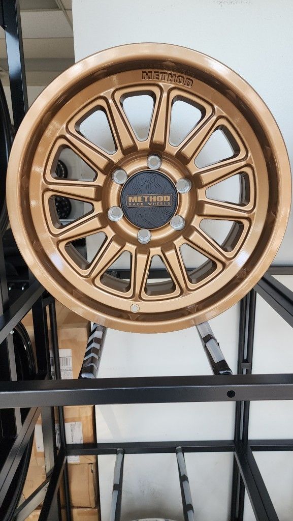 17" Method Off Road Wheels Chevy Gmc Toyota Ranger Nissan Brand new wheels Method MR323 gloss bronze 17x8.5" 6x139.7mm 0 mm offset $1000 set of 4 rims only Tires available 265 70 17 Falken wild peak AT4W Toyo open coutry RT Mickey Thompson Baja Boss AT $2000 installed 285 70 17 Nitto Ridge grappler $2100 installed Cash out the door