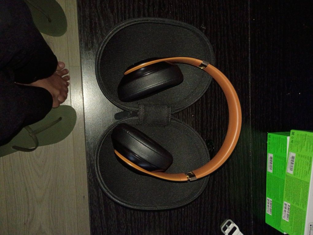 These are over-the-ear wireless headphones designed for studio monitoring and DJ use. They include features such as Bluetooth connectivity, an adjustable headband, and noise cancellation technology. The black and gold color scheme adds a stylish touch. The pair in the image appear in good condition and comes with a case, just no charger cord