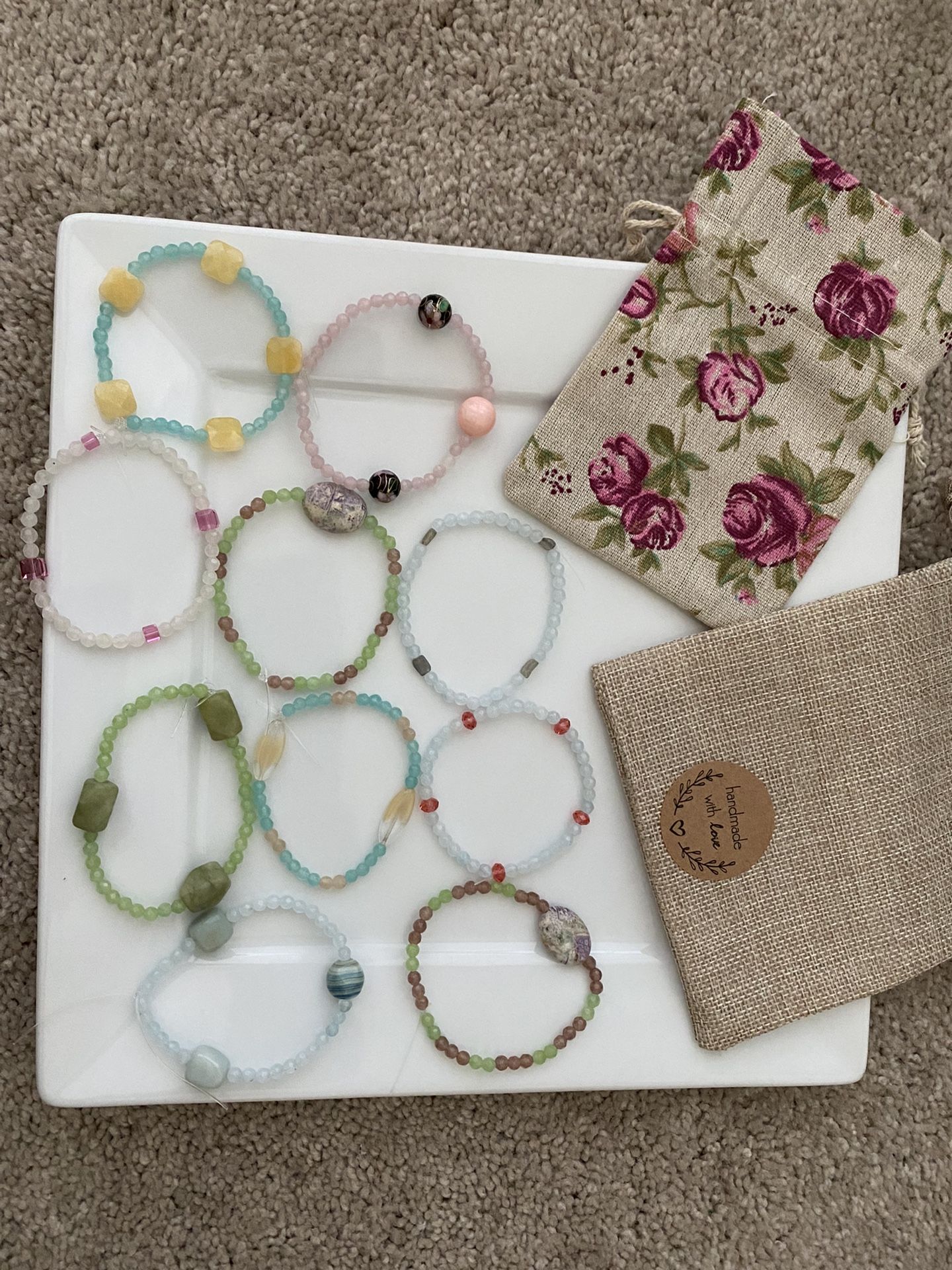 Handmade semiprecious and glass bead bracelet. Select your style- each handcrafted with perfect precision. Comes in a cloth rose or khaki bag. Great Holiday Gifts. Will offer multiple piece discount.
