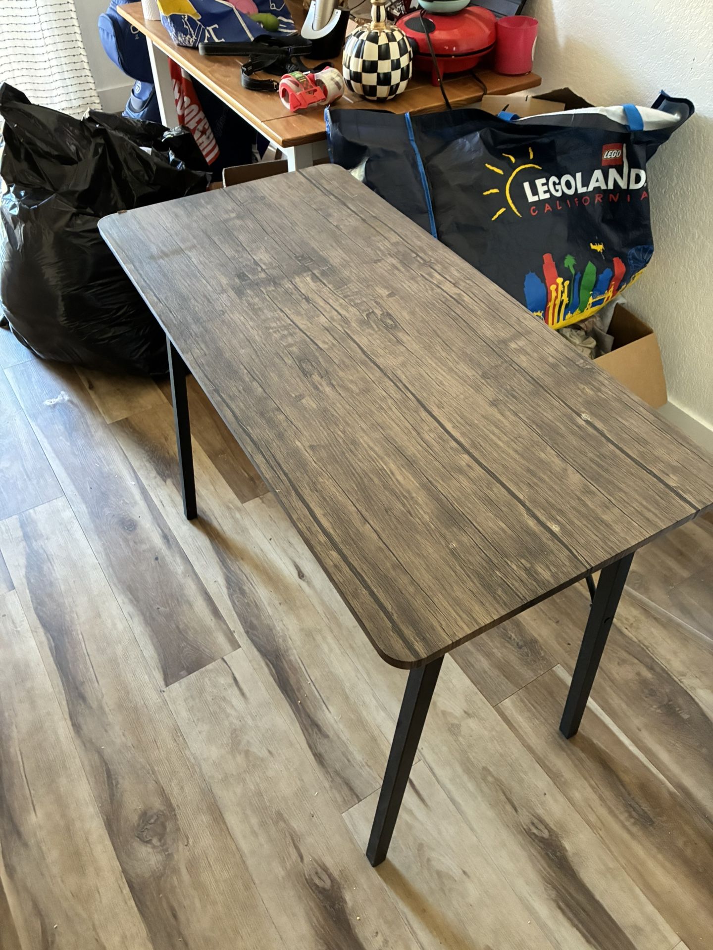 Simple, stylish desk with a warm rustic wood-look top and sleek black metal legs. Perfect for a home office, student workspace, or small dining table. • Wood-look tabletop with natural grain detail • Sturdy black metal legs • Great size for laptop + monitor setup • Neutral finish that works with farmhouse, modern, or industrial styles • Good condition – light normal wear from use Compact footprint but roomy enough for everyday work. Pickup only. Message me with questions!