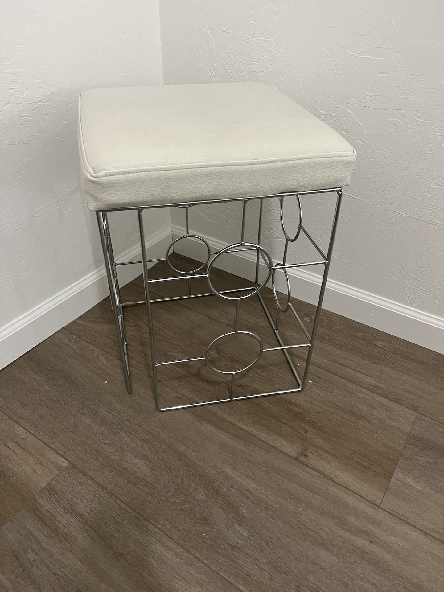 Hollywood Regency vanity make-up seat. Square shape white faux leather cushion attached to silver rectangular shaped metal seat. Beautiful, sturdy and easy to move around. Good vintage condition with normal wear of the cushion including tiny scratches as seen in one of the close up images. Some rust on the silver metal.