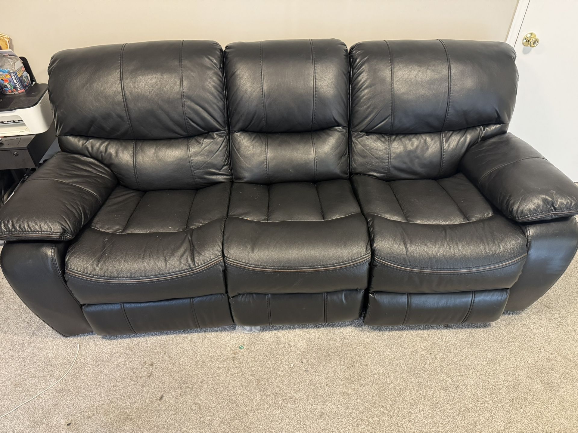 Comfy black leather reclining sofa set. First sofa features 3 seats (2 of which recline and one folds down into cup holders). Second sofa has 2 seats both of which recline, along with cup holders and built in storage. USB Ports are built into both sides of each couch as well. Leather is soft with minor scratches. Cushions are firm and supportive. Original Bob’s Listing here: https://offerup.com/redirect/?o=aHR0cHM6Ly93d3cubXlib2JzLmNvbS9mdXJuaXR1cmUvbGl2aW5nLXJvb20vbGl2aW5nLXJvb20tc2V0cy9wLzIwMDg2OTAxP3JlZ2lvbl9pZD0zMDEwMzIxMDEmZ2Nsc3JjPWF3LmRzJmdhZF9zb3VyY2U9MSZnYWRfY2FtcGFpZ25pZD0yMDQ1MjUxMzQzMCZnY2xpZD1DajBLQ1FpQWk5ckpCaENZQVJJc0FMeVBEdHRubW1ra1MxR3lsU09MbzJicjhKbzlqWi0zekF0TXQ4V0JhR0pnRUJYWXlsbWNkOWZ3aGFrYUFwdFNFQUx3X3djQg==