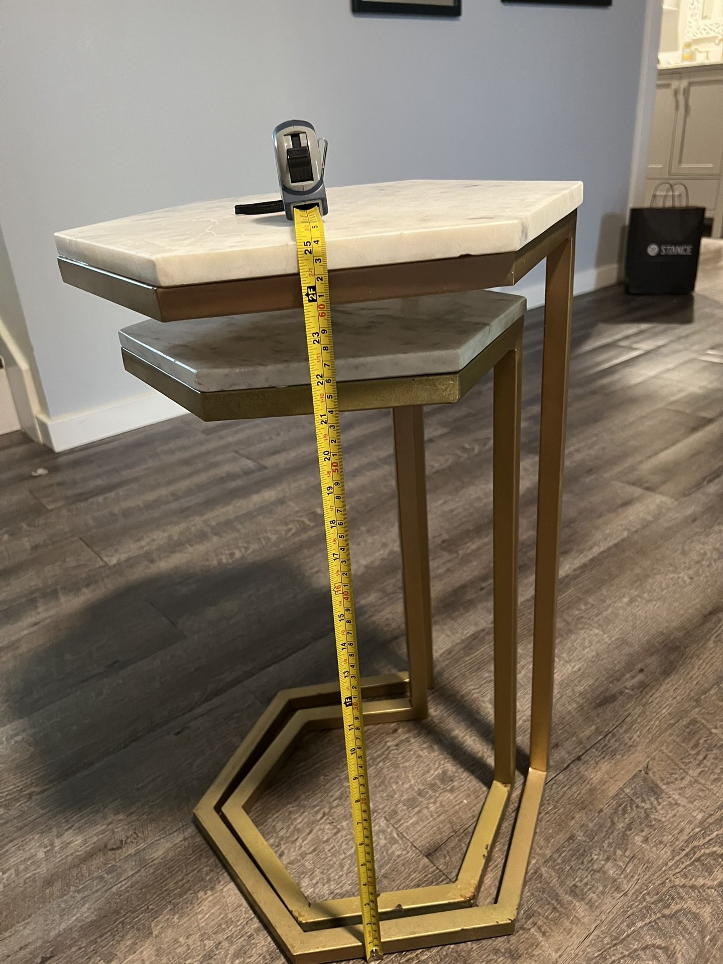 Stylish set of 2 hexagonal side tables. Marble tops are white with pretty veining. Gold metal bases have a geometric design. Larger table is around 24.5 inches tall with a top about 14 inches wide. Smaller table is around 20.5 inches tall with a top about 11 inches wide.