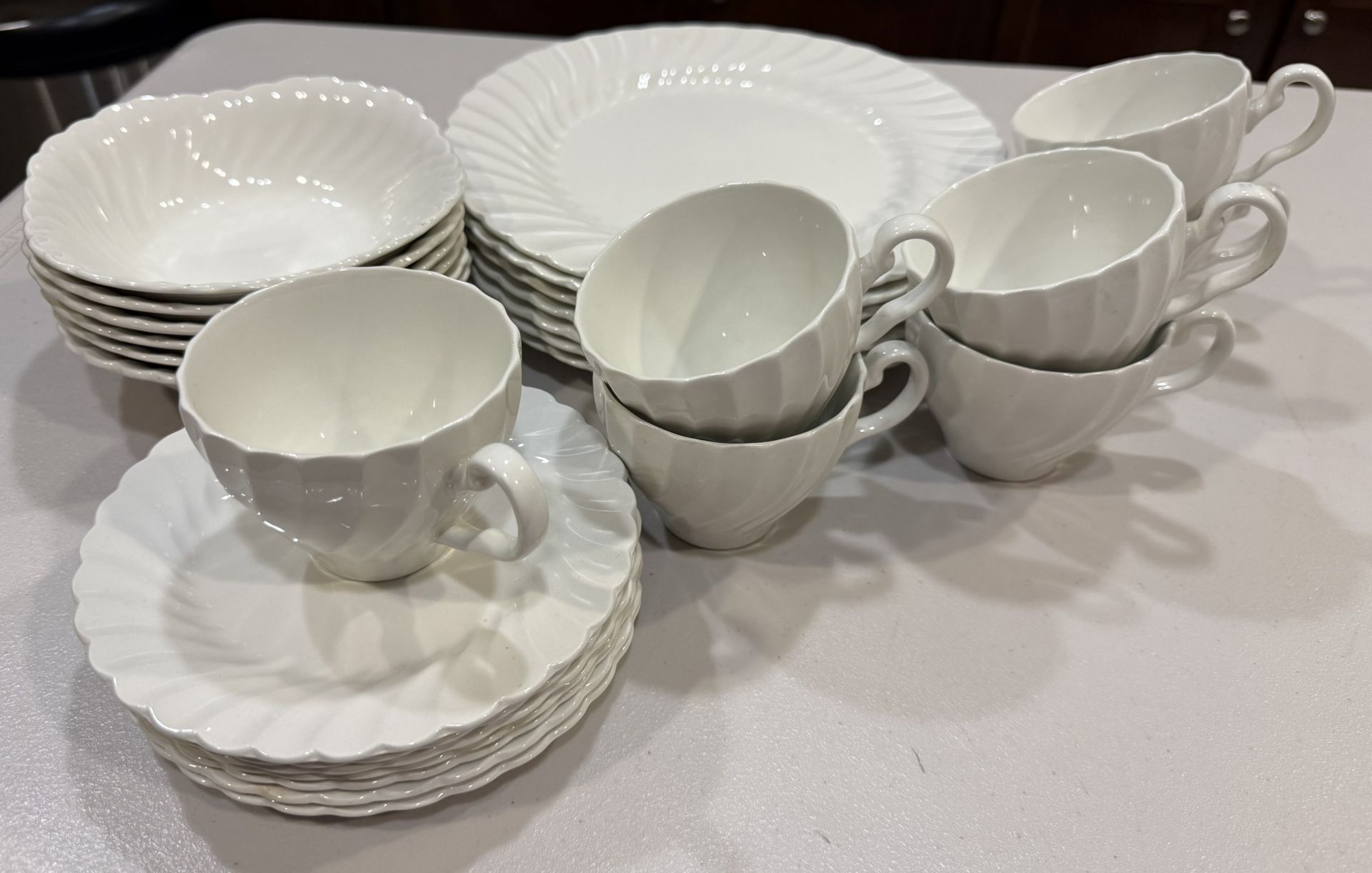 7-dinner plates 10” inches 6-cereal bowl 6 1/2” inches 7-plates 6 1/2” inches 7-cups 3” inches tall 3 1/2” wide Total of 27 pieces