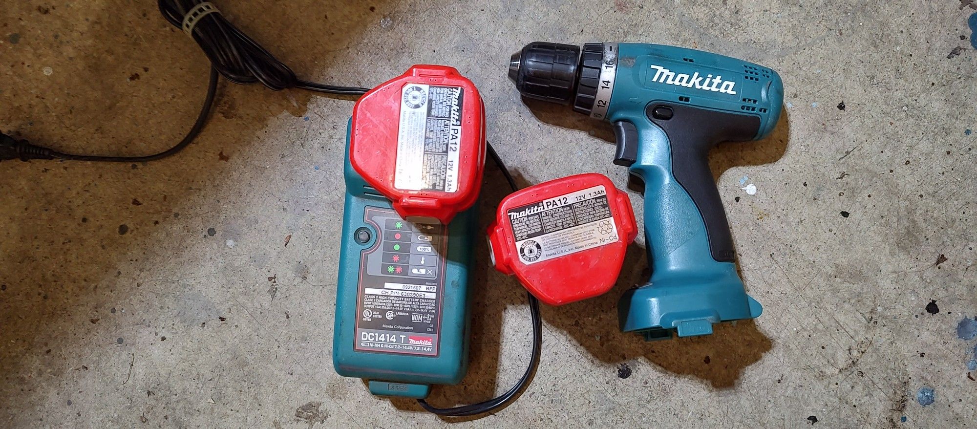 Makita hand drill with charger and two batteries. Works like New. Willing to sell charger separately with one battery