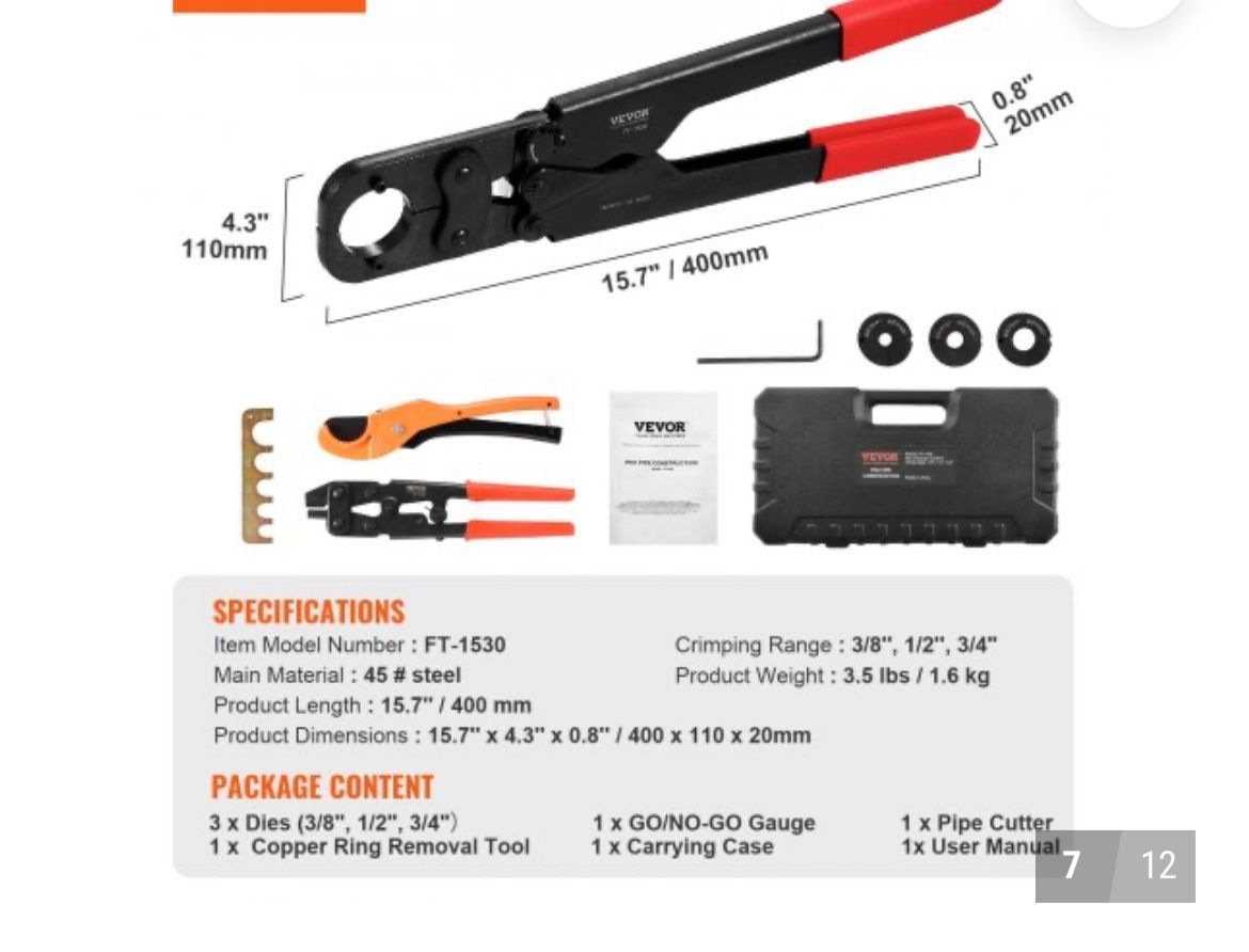 VEVOR PEX Pipe Crimping Tool Kit, Pro Press Crimper for 3/8", 1/2", 3/4" Crimp Rings, with 3 Jaw Dies, PEX Tubing Cutter, Go/No-Go Gauge, Copper Ring Removal Tool, Meets ASTM F1807 Standards Open box never use It new