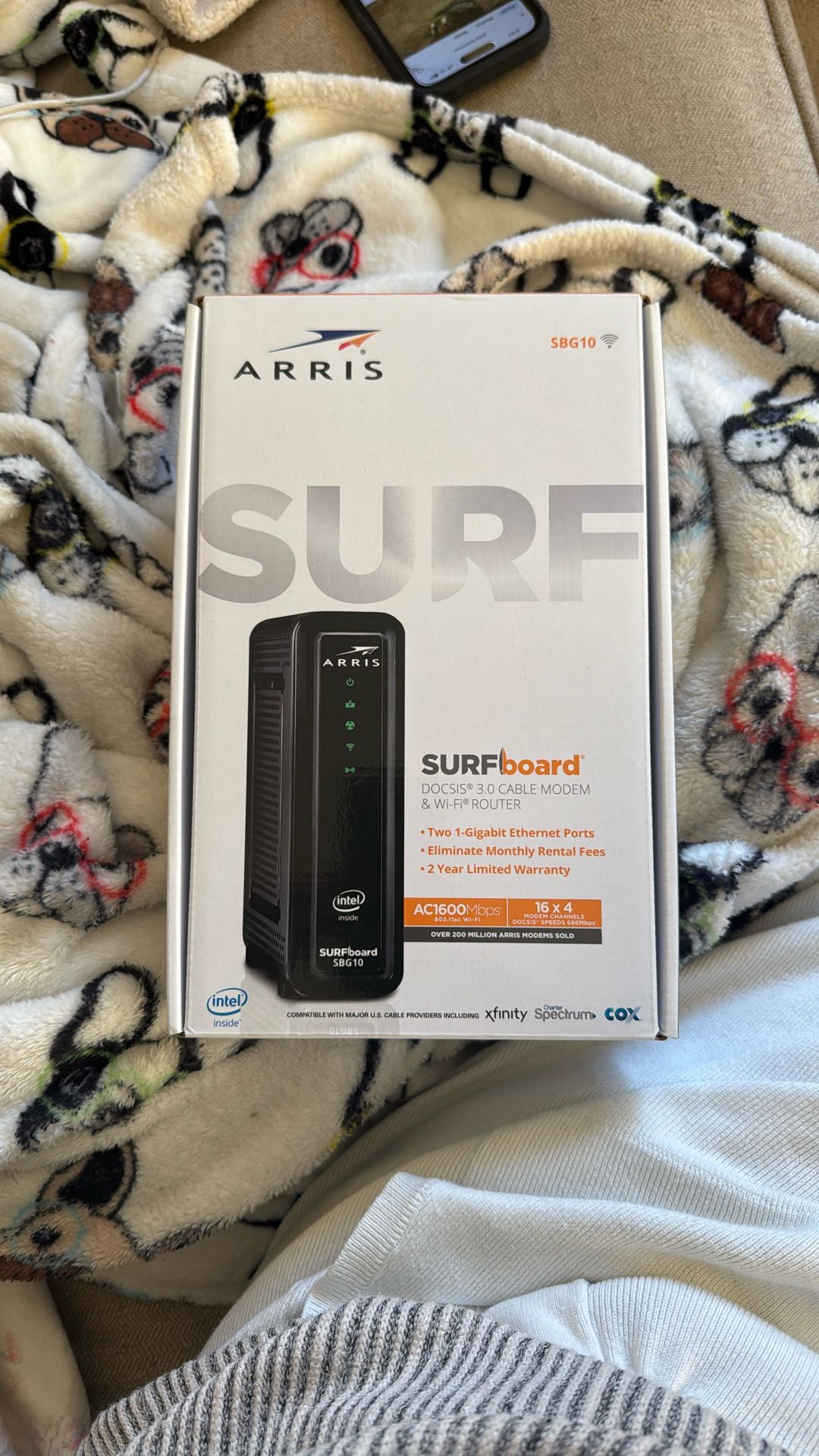 ARRIS SURFboard SBG10 cable modem + Wi-Fi router combo in excellent working condition. • DOCSIS 3.0 • AC1600 Wi-Fi • Two 1-Gigabit Ethernet ports • Great for cable internet plans up to ~300–400 Mbps • Compatible with major providers including Xfinity, Spectrum, and Cox • Factory reset and ready to set up • Includes original box and power cable Selling because I upgraded equipment. No issues — works perfectly. Pickup only. Cash / Zelle / Venmo accepted.