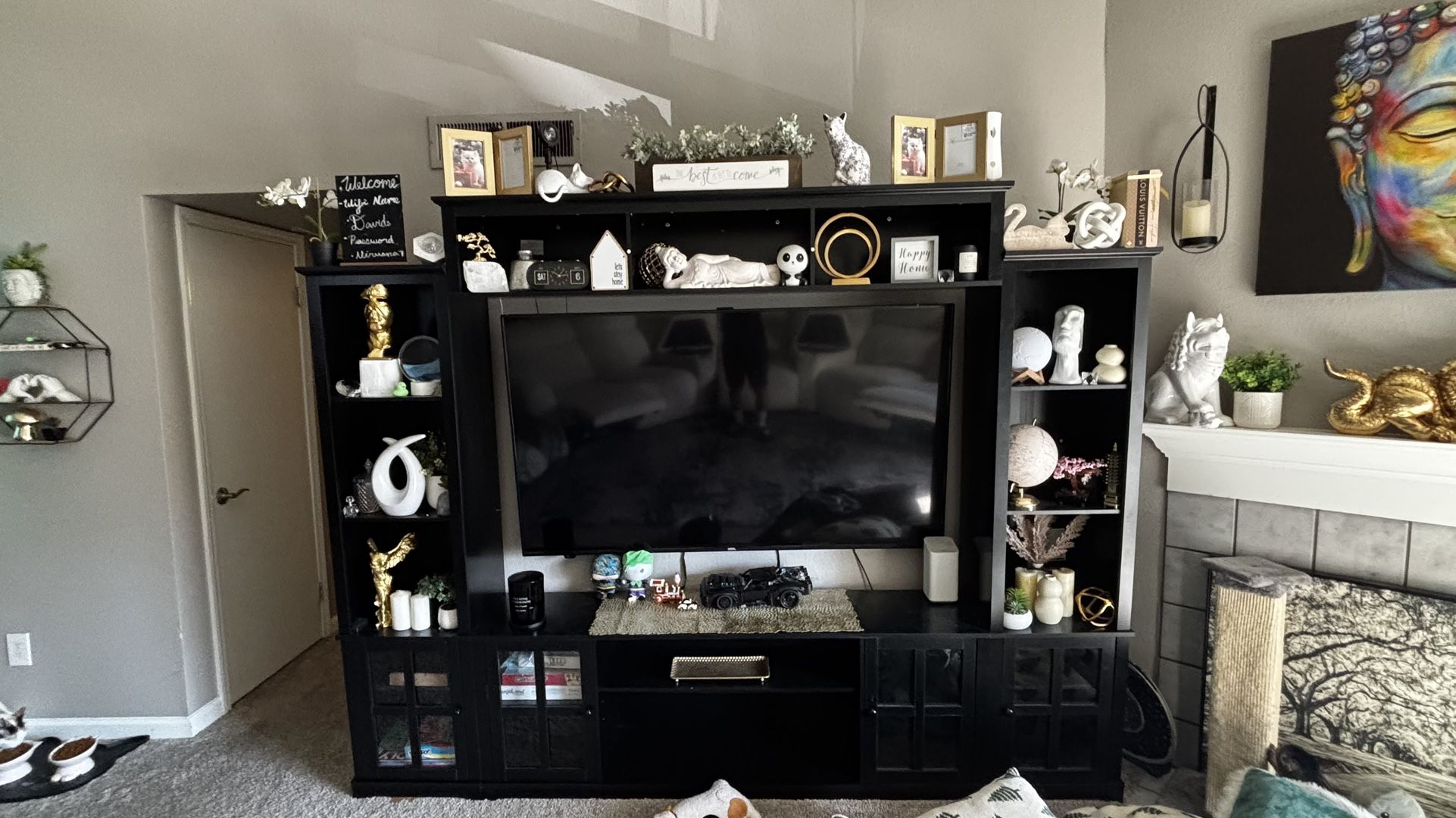 Huge easy assemble entertainment center with shelves perfect for your living room decor. (Decor is not included just entertainment center.)