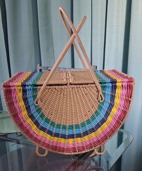 Rainbow Picnic Basket EUC Pink Blue Purple Orange Yellow Blue Tan W/top Carry Handles
