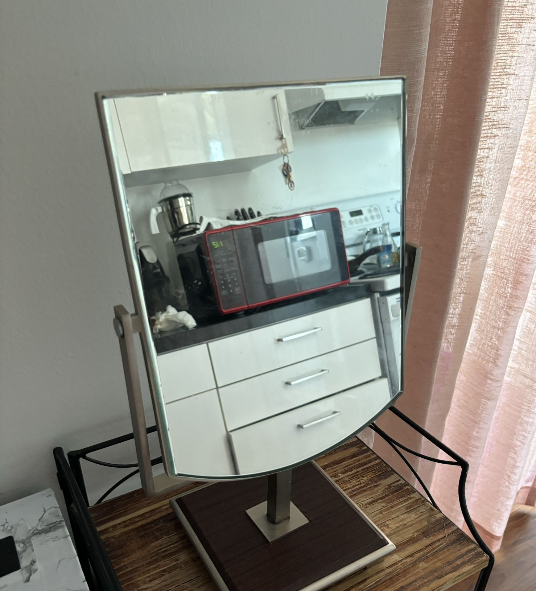 It’s like an antique mirror Two faced and rotatable and solid heavy