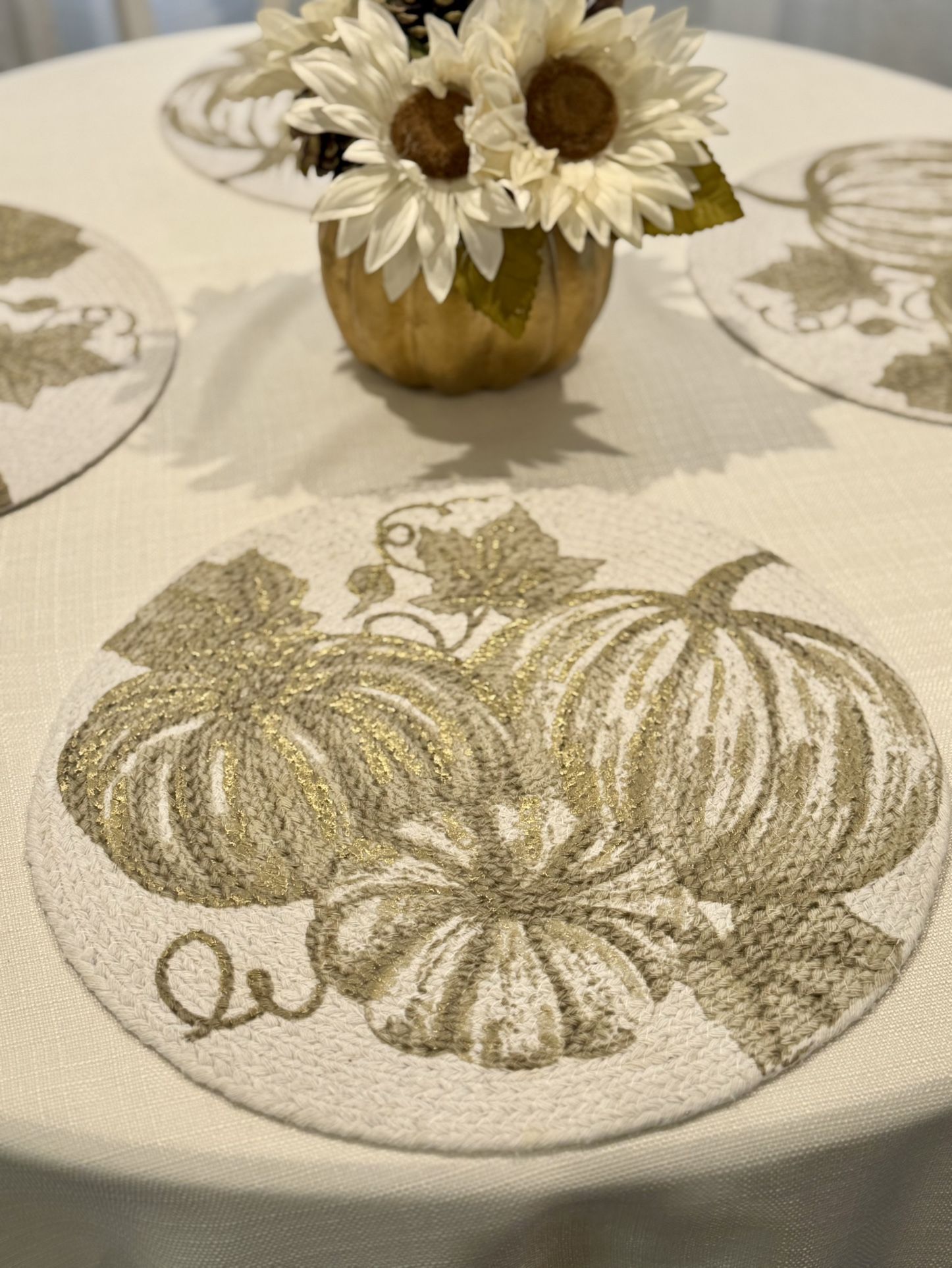 Beautiful set of 4 round braided placemats with gold pumpkin & leaf design. Perfect for fall / Thanksgiving table. Used only a few times and very well taken care of excellent condition, no stains, no damage, look almost new. $15 cash – FIRM PRICE Pickup only 📍Chula Vista First come, first served no holds without payment, thank you!