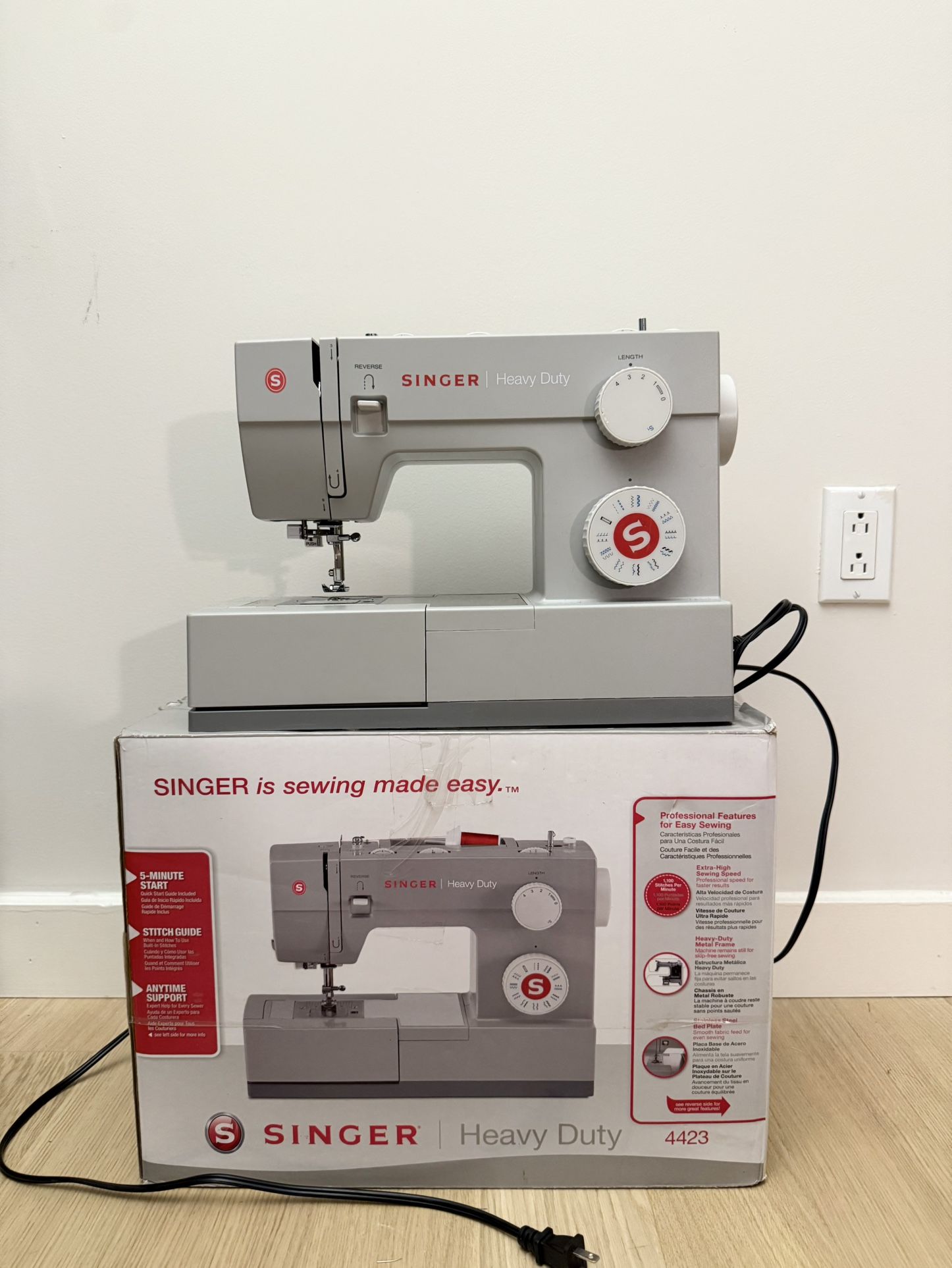 SINGER Heavy Duty 4423 Sewing Machine - Very good condition — no damage or broken parts. - Includes original foot pedal and box. - Can sew through most fabrics, including heavy materials. - Also supports button sewing and buttonholes. - Originally $220 — selling at a great price!