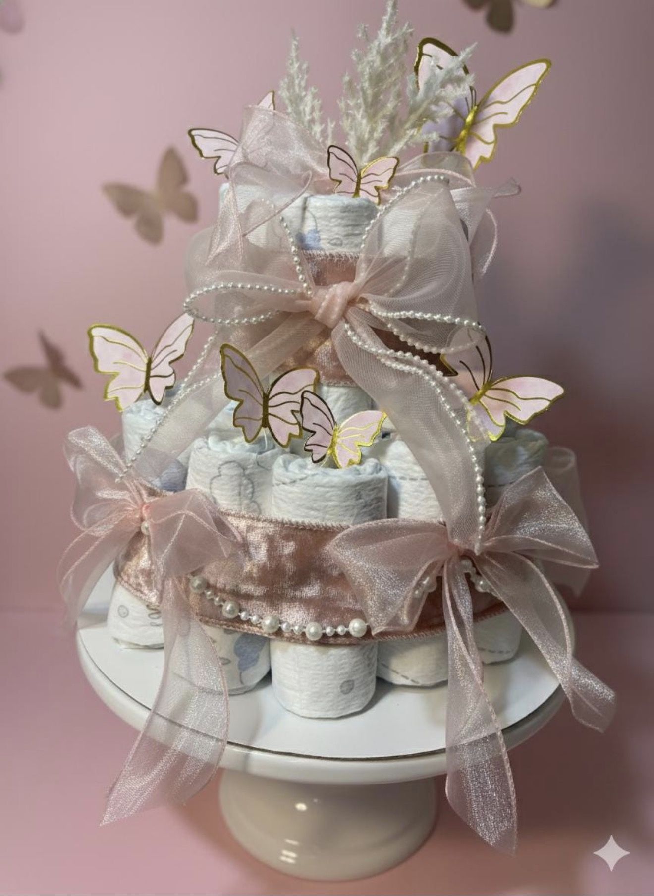 💗 Baby Girl Theme – Luxury Diaper Cake Our baby girl diaper cake is a beautifully handcrafted centerpiece created with elegance and attention to detail. Designed using high-quality diapers and soft feminine accents, this diaper cake is perfect for baby girl showers, sprinkle celebrations, or welcoming a new baby girl. Both decorative and practical, this premium diaper cake makes a timeless baby shower gift that parents will love and guests will admire. baby girl diaper cake, pink diaper cake, girl baby shower centerpiece, elegant diaper cake, luxury baby shower decor, premium diaper cake 🤍 Product Overview Our premium quality diaper cakes are thoughtfully handcrafted to serve as both a stunning baby shower centerpiece and a practical gift for new parents. Designed with elegance and attention to detail, each diaper cake is made using high-quality diapers and coordinated embellishments to match the chosen theme. Every diaper cake is hand-assembled with care, ensuring a polished, luxury presentation that arrives ready to display. 🎀 Product Details • Theme: Bay Girl Butterfly Theme • Number of Tiers: 2 • Diaper Brand: Pamper Swaddler • Diaper Size: Size 2 ( 6 diapers) Size 3 (20 diapers) • Total Diaper Count: 26 • Color Palette: Pink, Baby Pink, Gold, White. • Occasion: Baby Shower / Gender Reveal / New Baby Gift 🍼 What’s Included • Premium quality diapers • Decorative ribbons and embellishments • Coordinated themed accents • Fully assembled diaper cake • Ready-to-display upon arrival