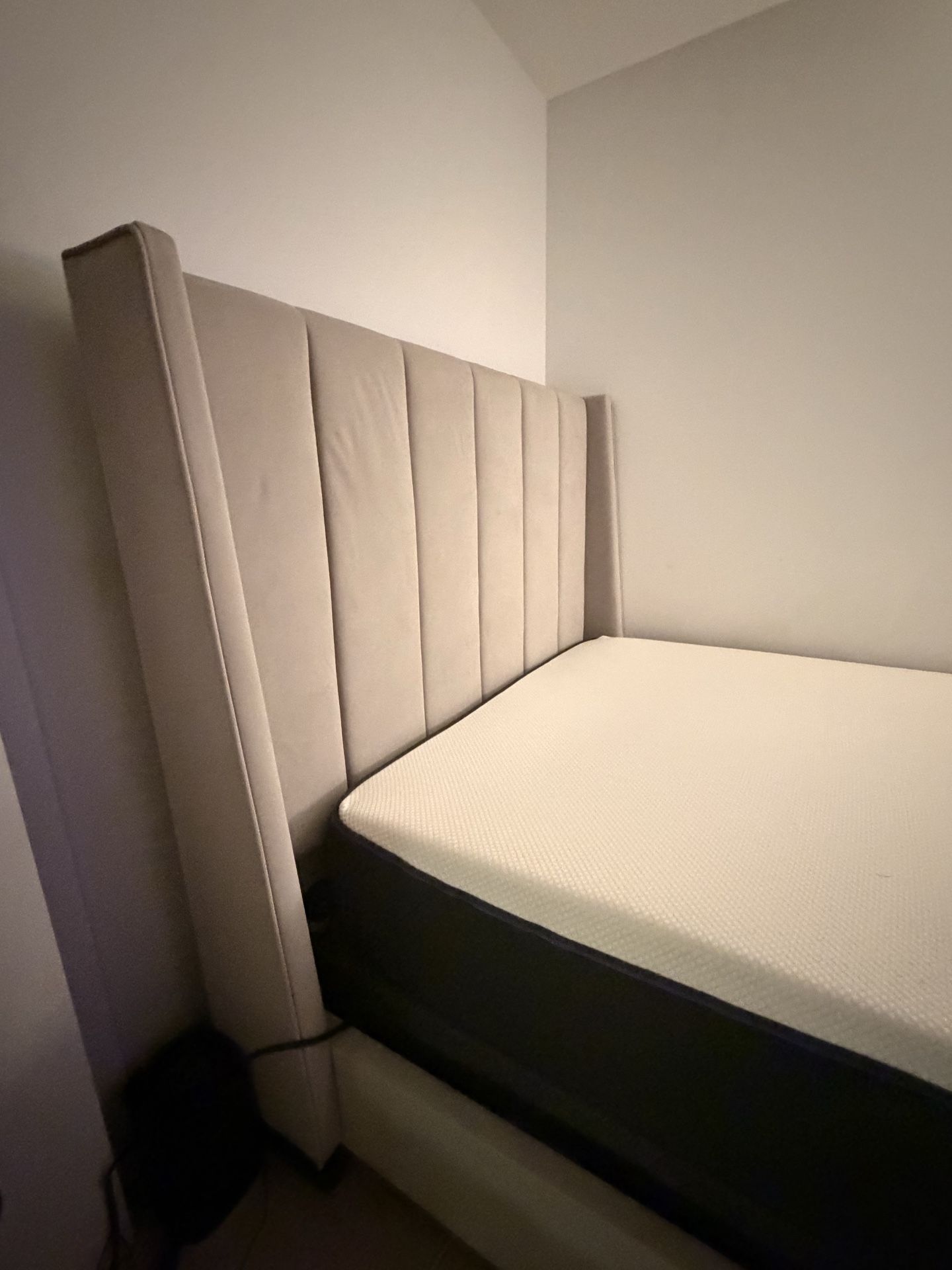 Queen sized bed frame (mattress not included)! Grey velvet material. Scuffs on one of the foot from a puppy but otherwise in great condition. Originally $795