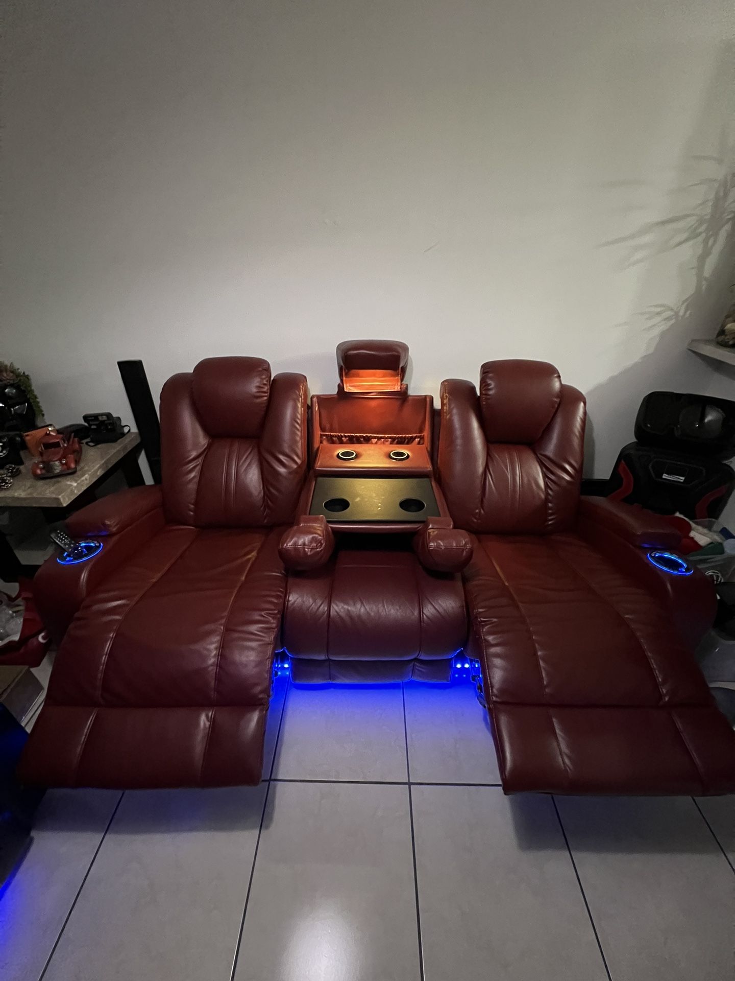 New condition Purchased from rooms to go with warranty Electric recliner, built in wireless phone charger, overhead lights for reading. Leather is in immaculate conditions One three seat red leather sofa One seater black leather lazy boy Cannot stress enough how good the condition is must see if seriously interested