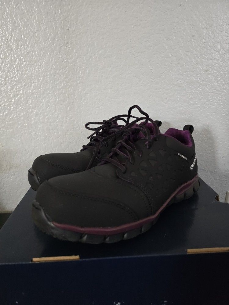 Reebok Sublite Cushion Work Shoe Women shoes Sublite Cushion Work achieves maximum lightness and flexibility in a work shoe. With deep flex grooves, the Sublite foam midsole reduces weight and allows for greater range of motion. Rubber pads provide traction at heel strike and forefoot takeoff while minimizing weight. EXOFUSE upper for lightweight flexibility and water resistance. A MemoryTech Massage footbed adapts to the unique contours of your foot. Type Athletic Work Shoe Toe Composite Toe Upper EXOFUSE Water Resistant Microfiber Color Black and Plum Lining Moisture Wicking Nylon Mesh Insole MemoryTech Massage 2.0 Memory Foam Removable Cushion Footbed Outsole Sublite EVA Cushion Midsole with SR Tread Rubber Heel and Forefoot Pads Special Features Extra Wide Toe, 100% Non-Metallic, Extremely Lightweight and Flexible, Dual Resistor Static Dissipative (SD10)Posturepedic Women's Athletic Work Shoe - Black and Plum Bought for 145 selling for 100. Used one. Perfect condition