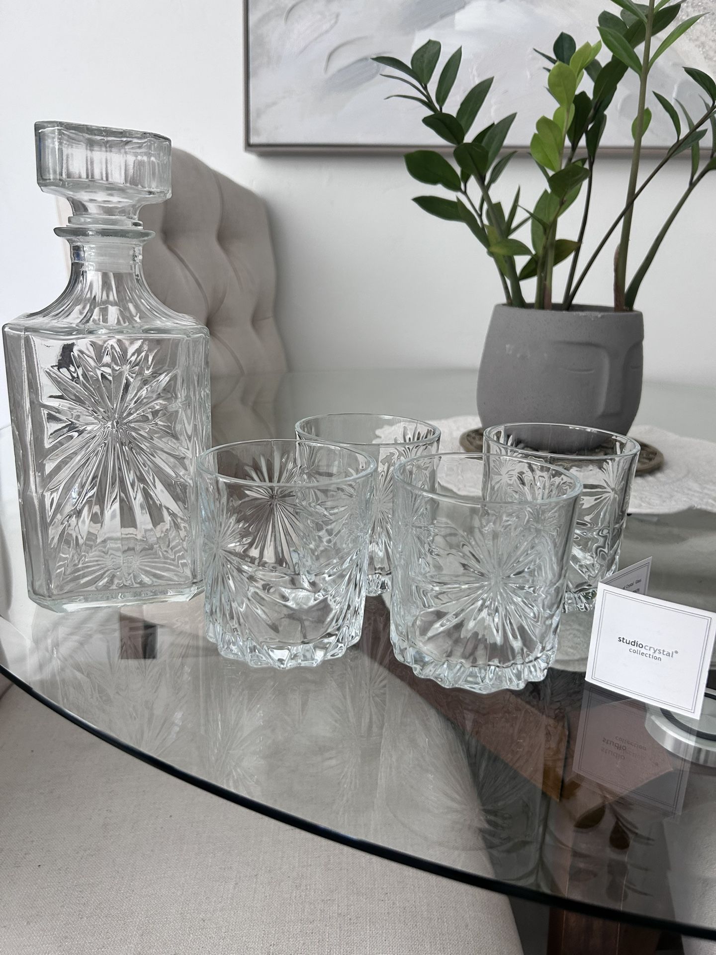 Beautiful crystal whiskey decanter set by Studio Crystal / Godinger. Includes a large decanter and four matching glasses with starburst cut design. Elegant set for a bar cart or gift. • Includes decanter + 4 glasses • Classic crystal pattern • Excellent condition Perfect for bourbon, whiskey, or cocktail lovers.