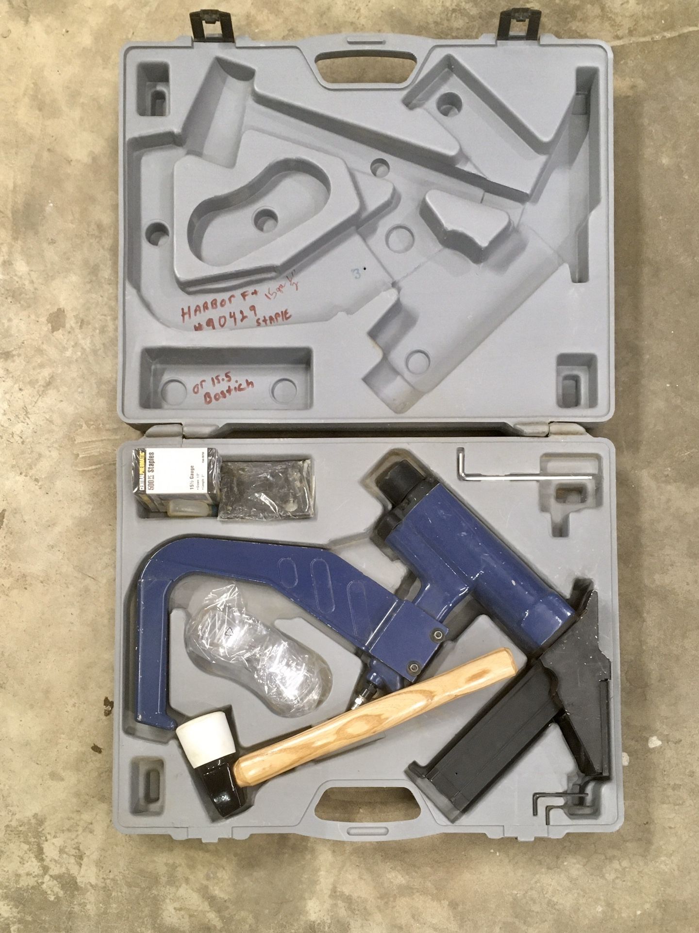 Flooring stapler. Works great. Staples are cheeper than nails. Comes with 1 new box of staples. The nailer. Installation hammer. And the case. Used on couple jobs but oiled regularly. Works on 1/2” and 3/4” hardwood and bamboo