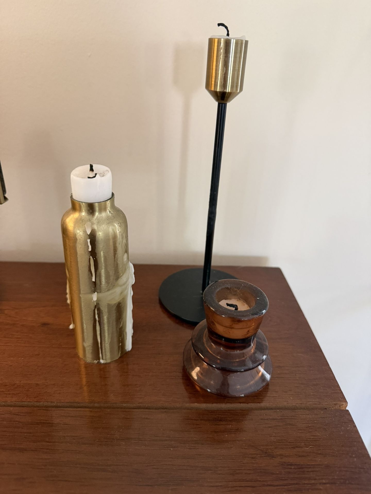 Mixed modern/vintage candle holders in brass and glass. Great for styling shelves or tables. Selling as a set. Minimal, cozy decor vibe. No low ballers. No trades.