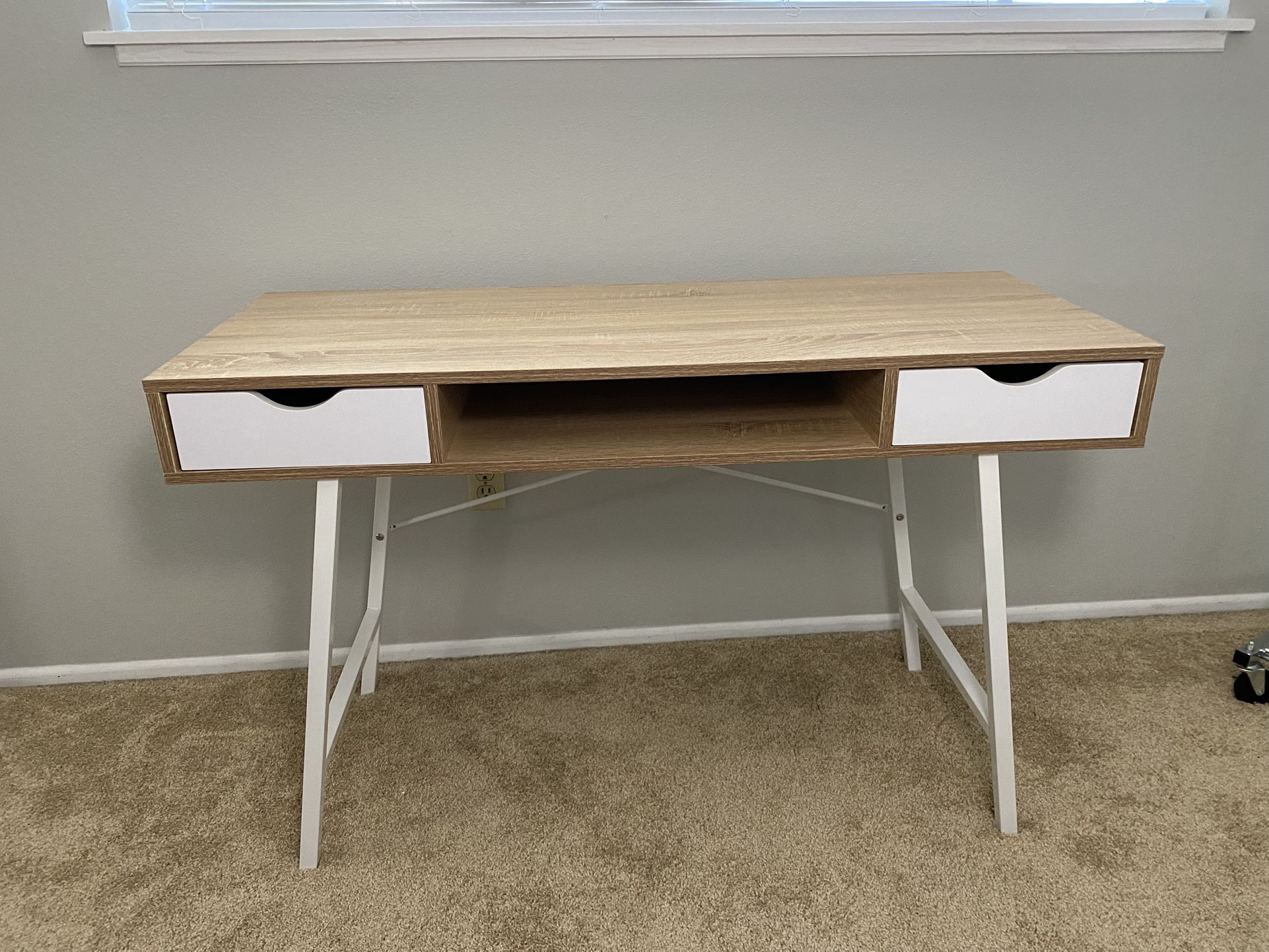 Details: • Width: 47 inches • Depth: 19 inches • Height: 30 inches • 2 smooth-glide drawers for storage • Open center shelf for books, keyboard, or décor • Sturdy white metal legs with cross-bracing for stability