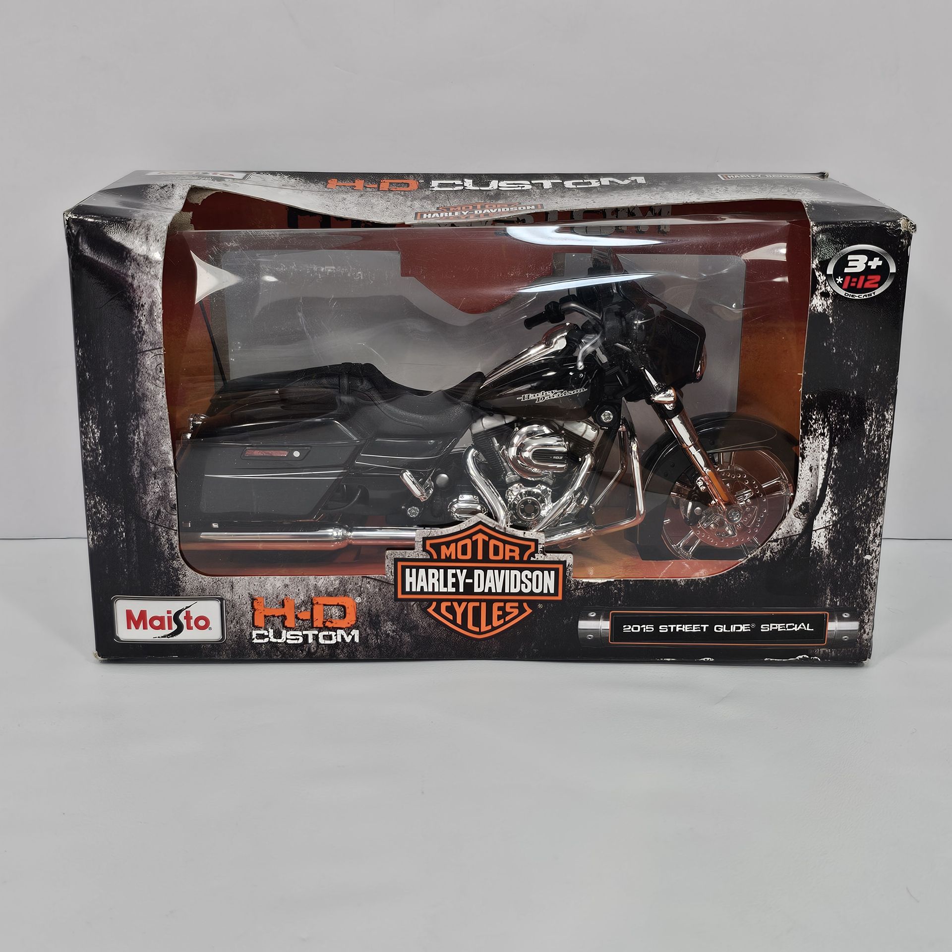 Authentic Maisto 1:12 scale replica of the 2015 Harley Street Glide Special in glossy black, item #32328. Diecast metal body with plastic detail parts, chrome-look engine, detailed wheels, and touring saddlebags for a realistic custom bagger look. Features working steering, detailed suspension, kickstand, and realistic cockpit for display on shelf or desk. Item is unused and still secured in original window packaging; outer carton shows light edge and corner wear as shown in photos, but contents remain untouched. Great addition for motorcycle enthusiasts, diecast collectors, or Harley fans seeking a modern touring bike miniature. collector model, diecast motorcycle, scale replica, touring cruiser, custom bike, desktop display, gift for rider, hobby collection, display piece, model garage