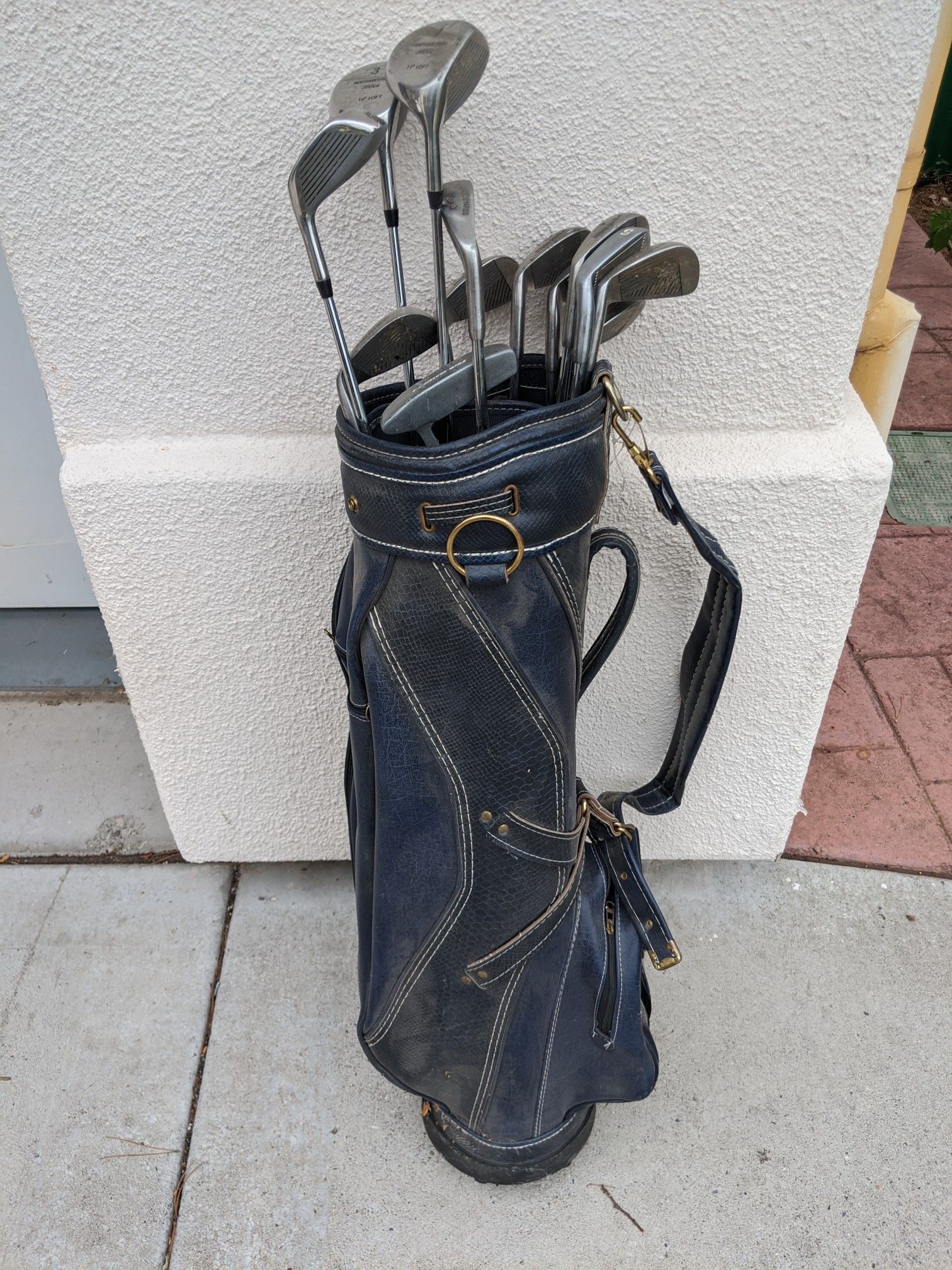 Full set of mens golf clubs with blue leather bag. From early 2000's or mid 1990's. Used for a couple of years but have been sitting for the last 10 or 15 years. Buy the set for $99. Or best offer Or barter.