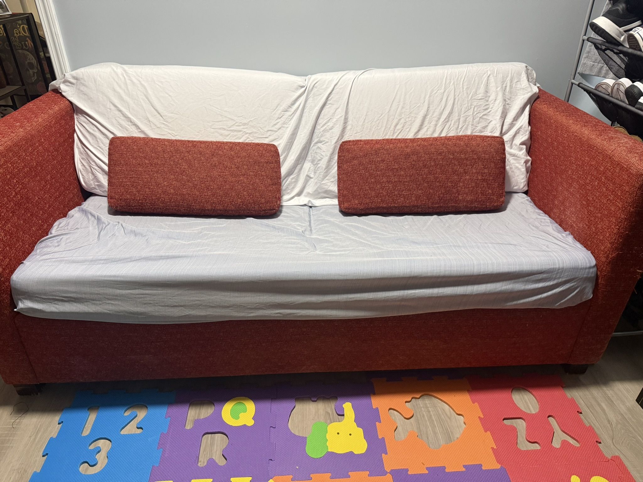 Sofa bed in good condition. Converts into bed easily. Frame is sturdy does make some noise when used as a bed but works fine. Great for guest room or temporary use. Pickup only.
