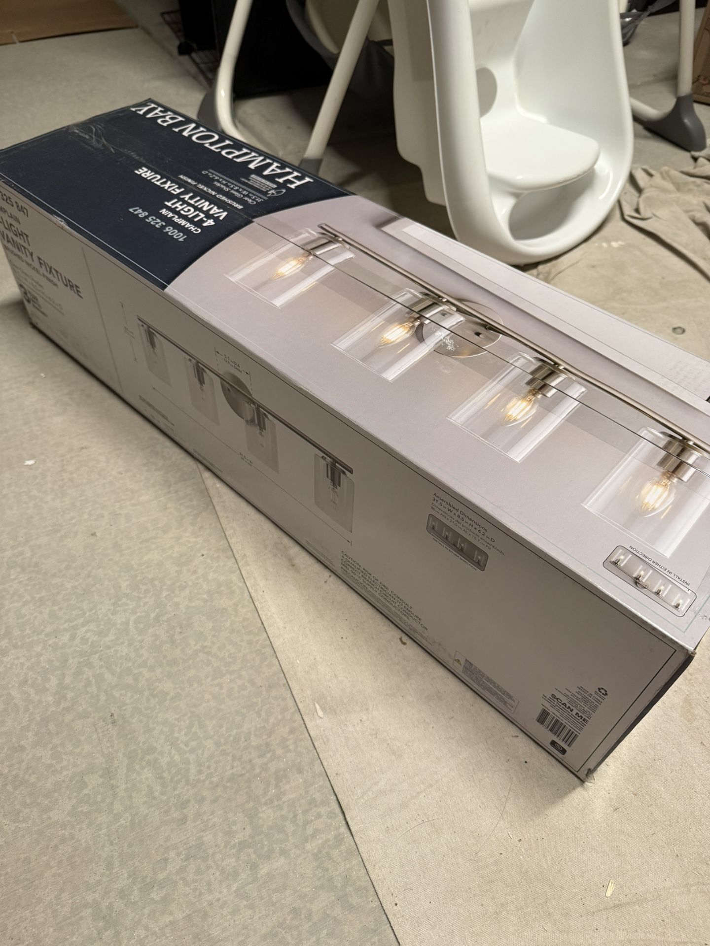 Hampton Bay Champlain 31.5 in. 4-Light Brushed Nickel Modern Bathroom Vanity Light with Clear Glass Shades - Brushed nickel finish - Clear glass shades - 31-1/2 in. W x 8-1/2 in. H - Uses four 60-Watt candelabra base bulbs (not included) - Fixture can be installed with shades facing upwards or downwards - Includes all mounting hardware for quick and easy installation Brand new, retails $114, asking $60
