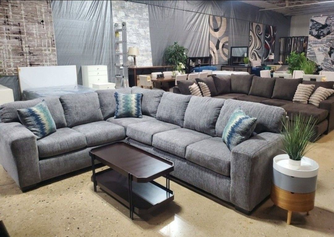 Beautiful Gray Fabric Sectional With 3 Throw Pillows (New)