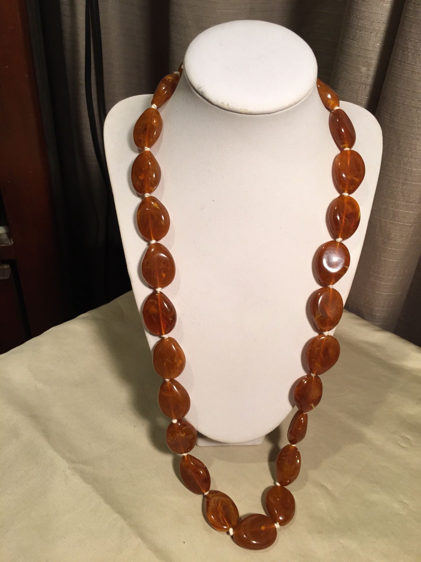 This necklace measures 28” long. Each bead is 1” long by 5/8” wide by 1/4” deep. The cord is knotted between each bead. It is in very good condition.
