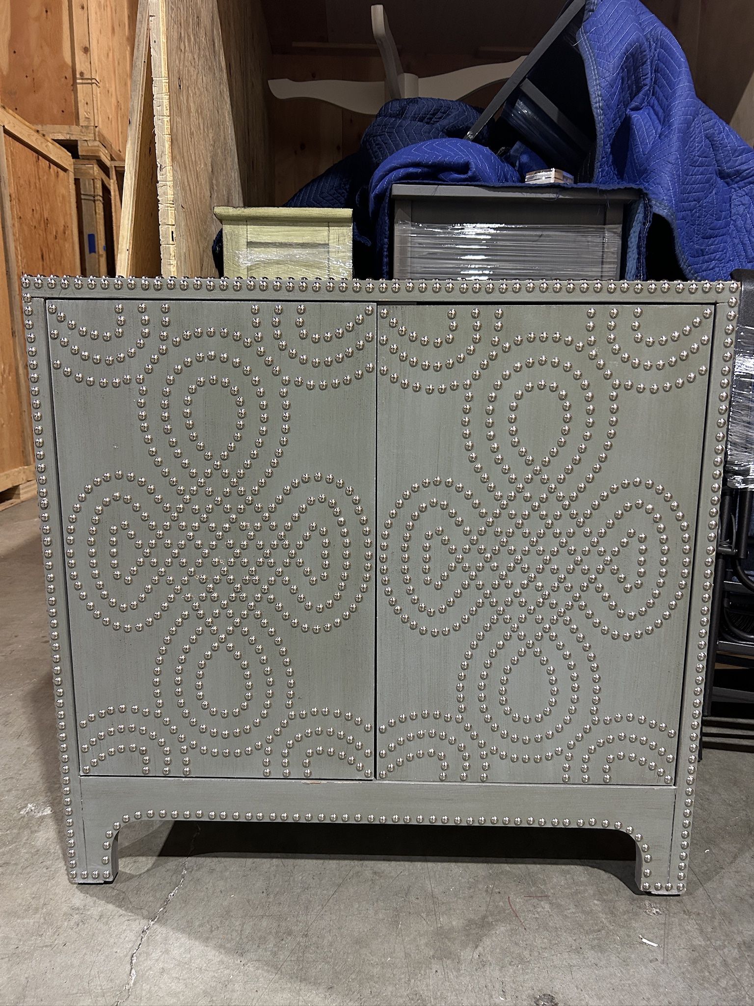 Pretty cabinet. Great as an entryway piece or bar storage. Gray with studded design. One shelf inside, some small nicks on top near studs from age. 36 w x 14d x 34.5 h Venmo/paypal/cash