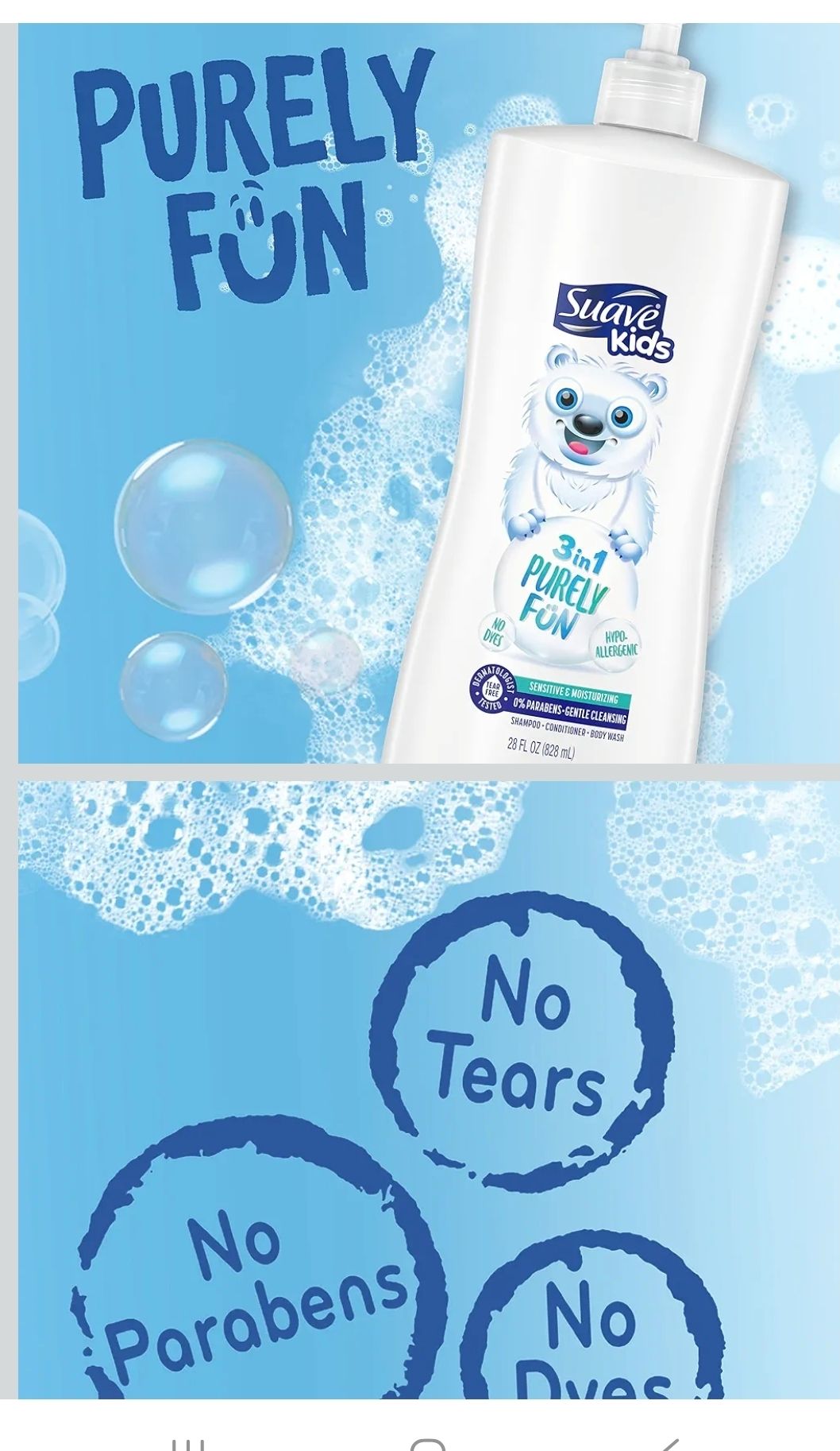 Suave Kids 3-in-1 Shampoo Conditioner Body Wash Purely Fun Makes Bath Time Quick and Easy, Paraben Free and Dermatologist Tested Kids Shampoo 3 in 1 F