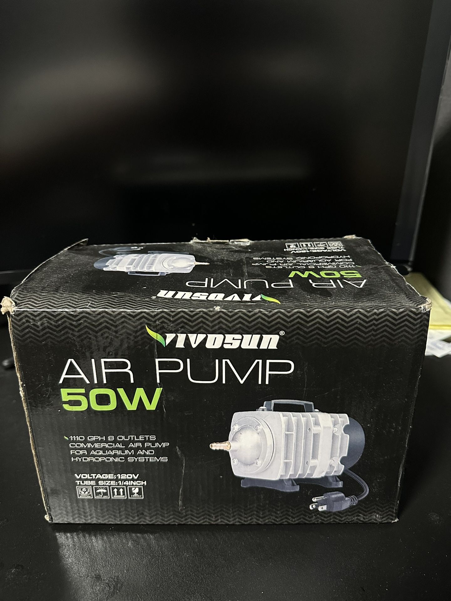 Selling a BRAND NEW NEVER USED 50W commercial air pump in good working condition. Great for aquariums, fish tanks, or hydroponic systems. Powerful 50W motor 110 GPH airflow 8 outlets (run multiple air lines at once) Works with 1/4 inch tubing 120V standard plug Durable and reliable for long use Box is a little worn but the pump itself is BRAND NEW Never USED works great. Perfect for anyone running multiple tanks or needing strong aeration. Message me if interested π