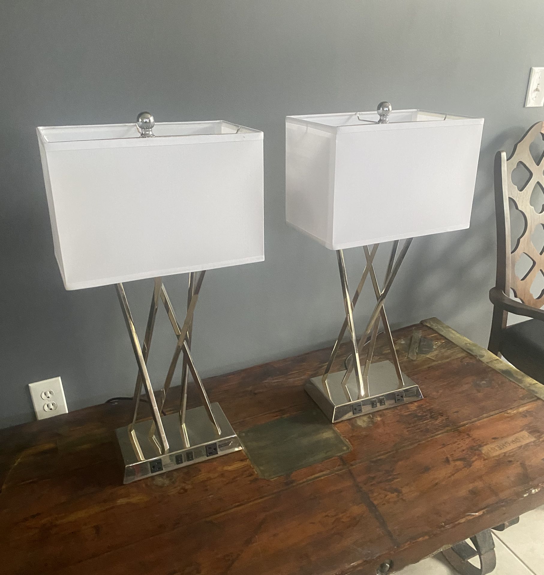 Price is for BOTH Silver Metal Base Rectangular Linen White Shades (2) Integrated Outlets 30"H x 15"W Take (2) Regular Bulbs Good Clean Working Condition 33155 Pickup