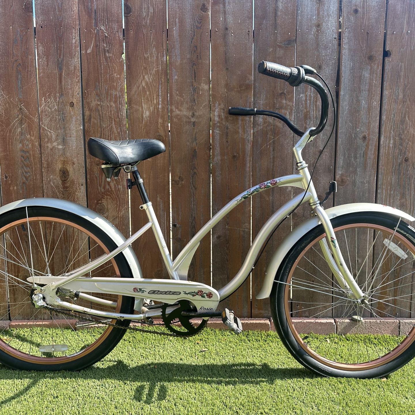 ๐ ๐๏ธ ๐ด ๐ฒ ๐ Electra Rosie model 26 inch womenโs beach cruiser. Pearl Silver with Bronze rims. Three speed internal hub with coaster brake.