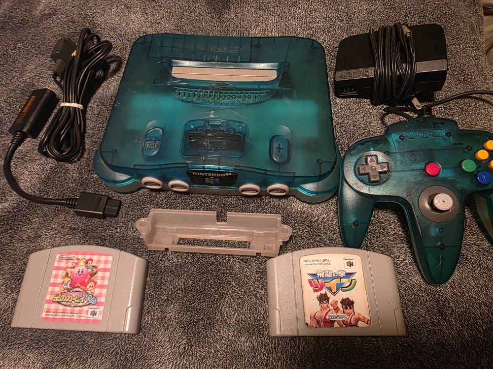Nintendo N64 Japanese Green Clear White Blue Video Game Console Japanese Exclusive console, modified to play both Japanese and US games. Comes with everything you need including an hdmi adapter 2 Japanese games. Kirby and some other game. Diddy Kong racing is NOT included 180 firm