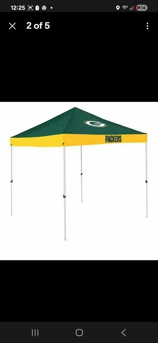 NFL, GREEN BAY PACKERS, COLEMAN PREOWNED canopy tent, PACKERS logo is printed on 2 sides. The canopy retracts to 4 feet for easy portability and storage and includes ground stakes for extra stability. Water-resistant canopy top made of 210 denier polyester Secondary team color and nickname on valance 6' height clearance Retracts to 4' for easy portability and storage Great on game day, at the beach or camping Measurements: Approx. 9'L X 9'W x 9'H, (has small hold on bag only, snagged on something) firm