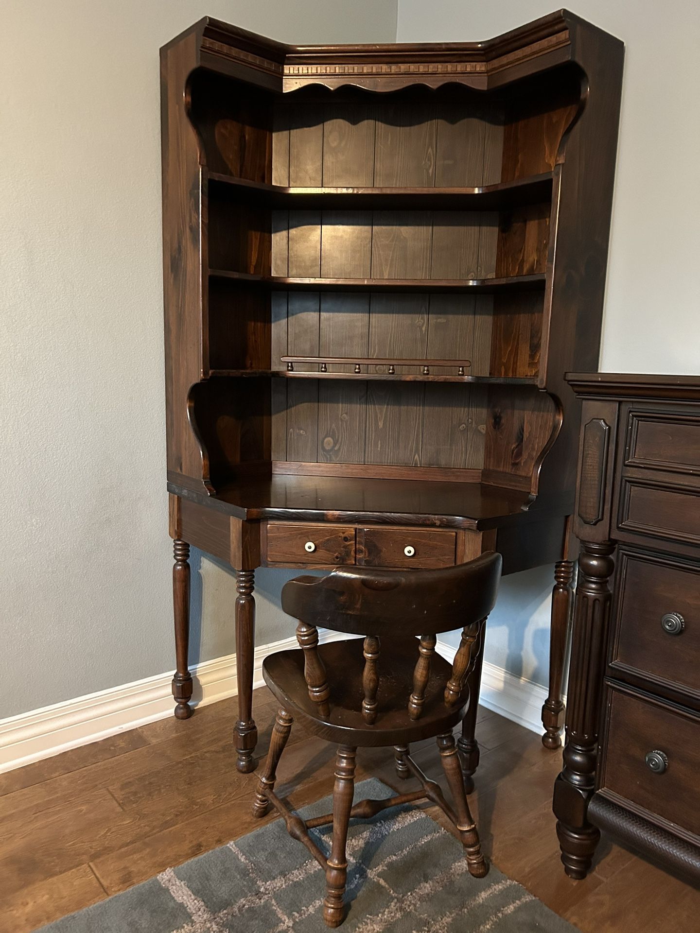 I’m offering up a vintage Ethan Allen Corner Desk with Hutch & Chair. This collection is quality craftsmanship from the solid woods and deep patina to the exquisite shape, top scalloped decorative trim, bottom shelf rail, and spindle desk legs, complimenting the chair’s backrest design. The bookshelves offer ample storage and decorative space for your books, trophies, memorabilia, and collectibles. The desk and chair surface have some divots and scratches that honestly add authenticity to its age and charm, further the dark staining makes it hard to tell. I’m downsizing now, so clearing out spare rooms. Popular vintage piece! *Measurements: (W x D x H) 4.25’ (back corners, left to right) x 3’1.5” (back corner “dead space” to desk’s center) x 6’6.25” *REDUCED $140 or best reasonable offer - CASH preferred; Offering at a private estate sale this weekend, so willing to accept Zelle & tap to pay as well. *Local in person buyer to carry and transport only! *Serious inquirers please message me for more details and/or to schedule a viewing. *See my profile for a household of furniture and decor items being reduced and added.