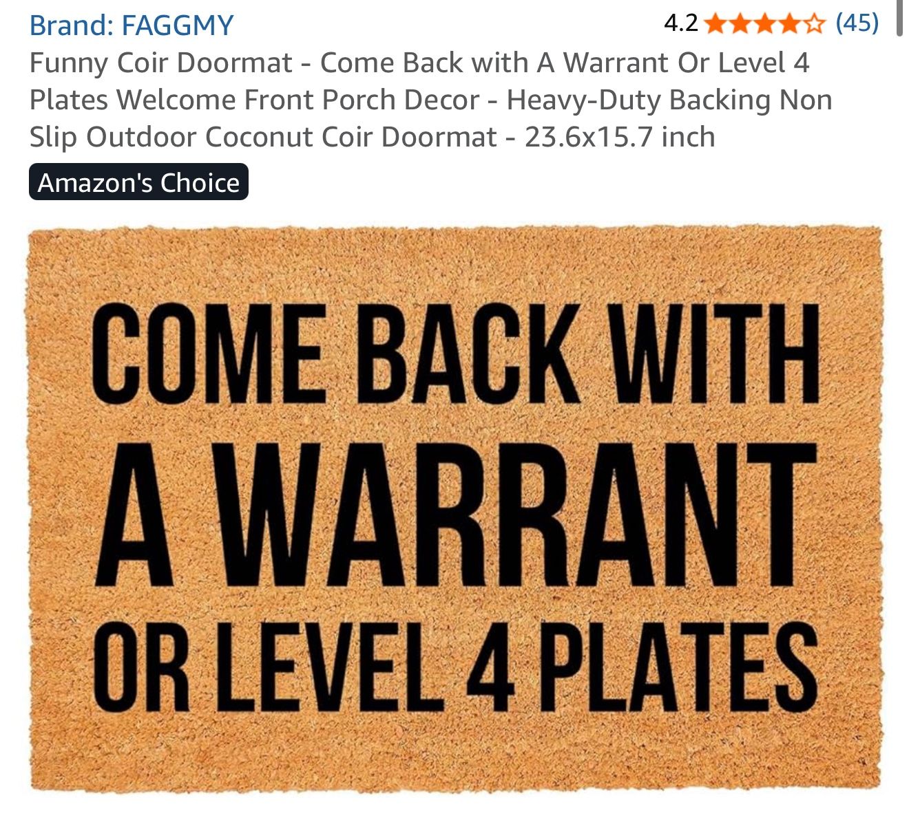 Funny Coir Doormat - Come Back with A Warrant Or Level 4 Plates Welcome Front Porch Decor - Heavy-Duty Backing Non Slip Outdoor Coconut Coir Doormat - 23.6x15.7 inch, new