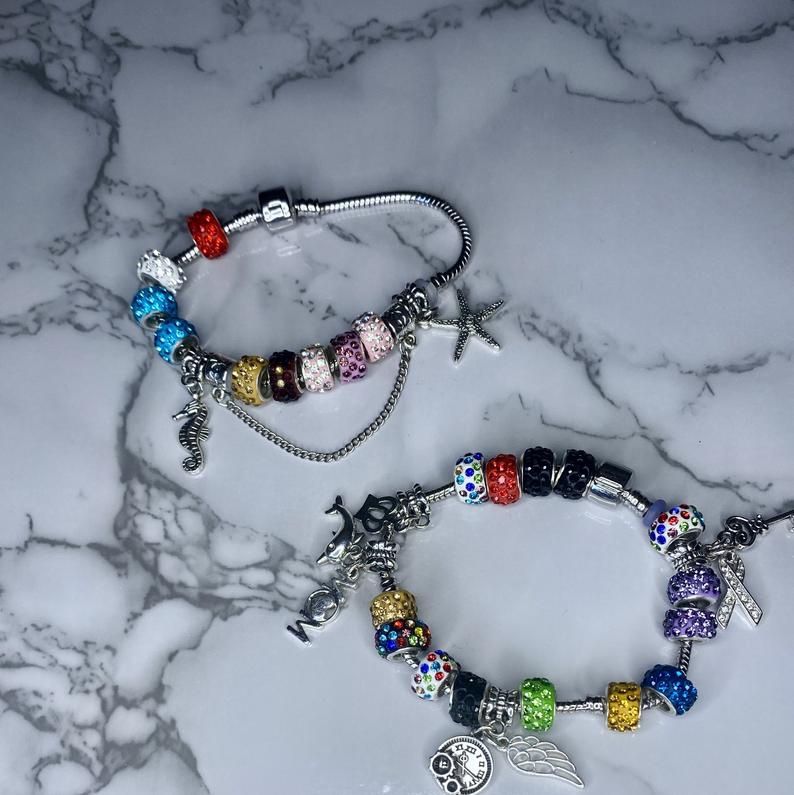 This diamond beaded bracelet is handmade. Comes with 3 assorted charms Diamond beads also comes assorted Lobster clasps so it’s easy to take on and off If you have any questions feel free to message me thanks