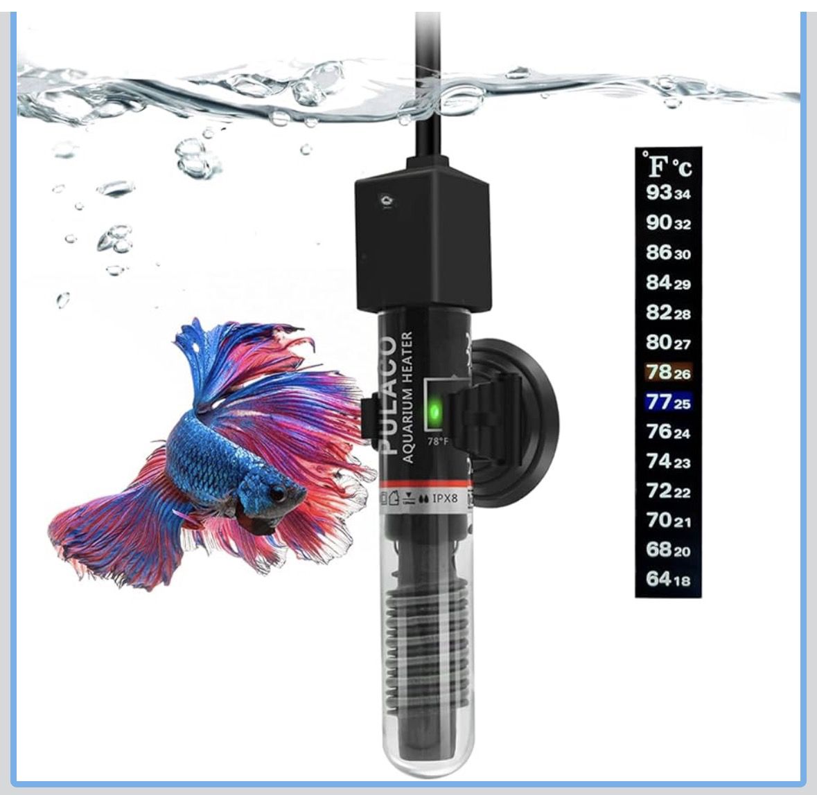 PULACO 25Watt Mini Aquarium Submersible Betta Heater with Free Thermometer Strip for 1-6 Gallon Fish Tanks (Preset Temperature 78℉)