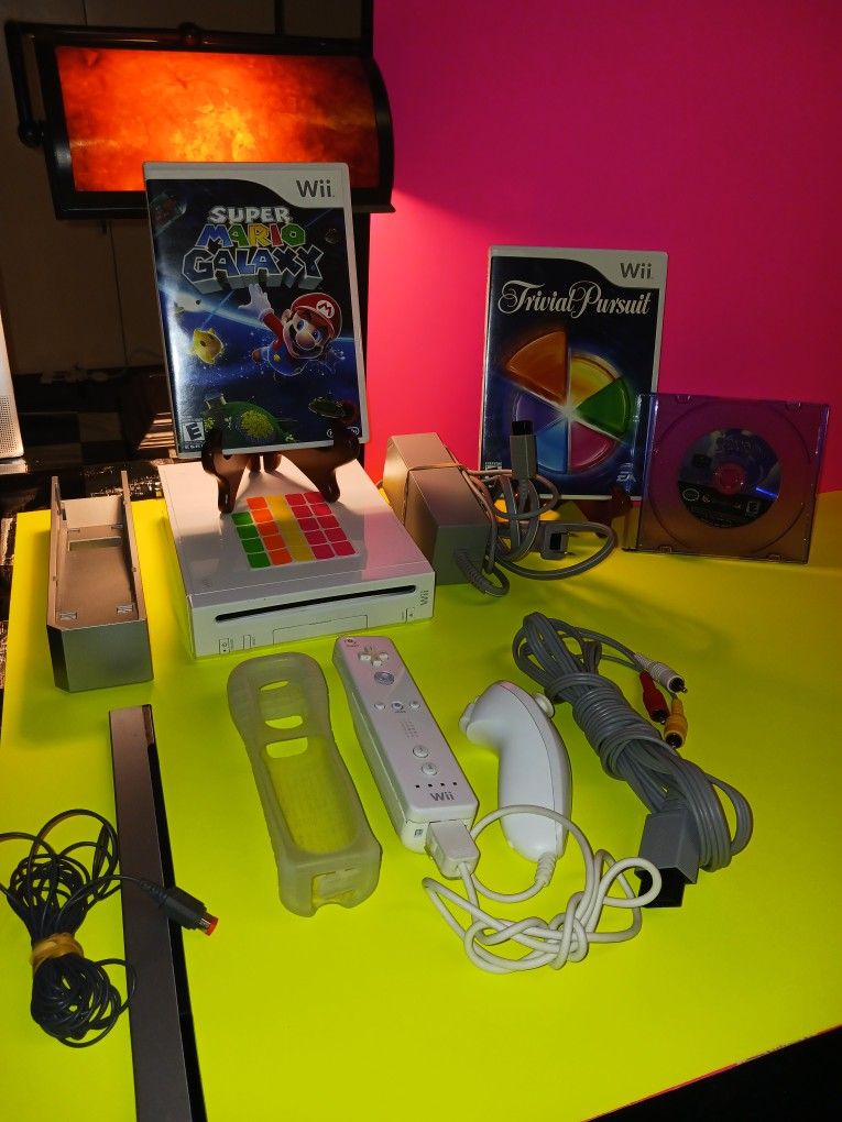 Nintendo, Nintendo Wii/ Nintendo GameCube compatibility system all original including all components. Comes with one original Wii remote Plus one original nunchuck including silicone rubber grip for remote Nintendo brand also Nintendo brand sensor bar AV plugs power brick and stand all doors on this Nintendo are intact and in mint condition along with the console no dust, comes from a smoke-free home with no children or pets! This Nintendo Wii is all original all the way down to the stickers on the GameCube Port doors. Also including Spyro the Dragon into the dragonfly! Plus Trivial Pursuit with its original artwork booklets and mint condition disc as well, Just reduced to $170 cash and local pickup, I've had a lot of people say what's Cash and Carry they don't have a great gaming day.