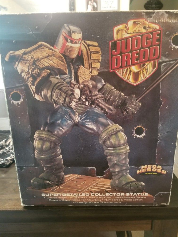 JUDGE DREDD MATTEL MEGA HEROES 12 INCH STATUE. MISSING SCREW THAT ATTACHES STATUE TO BASE. ADULT COLLECTOR OWNED. RARE HARD TO FIND Keywords DC comics Marvel Star wars Wwe