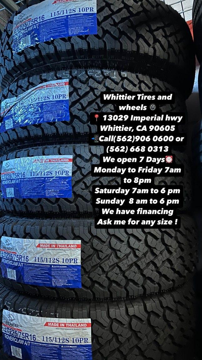 WHITTIER TIRES 13029 IMPERIAL HWY WHITTIER CA 90605 CALL (562)906-0600 TEXT (562)413-6926 - WE HAVE THE BIGGEST USED & NEW TIRE INVENTORY AVAILABLE, ASKS US FOR ANY SIZE YOU NEED. FINANCING OPTIONS AVAILABLE, 90 DAY NO INTEREST! HABLAMOS ESPAñOL. OPEN MONDAY-FRIDAY 7AM-8PM, SATURDAY 7AM-6PM, SUNDAY 8AM-5PM 185/65/14 175/65/15 185/55/15 185/65/15 195/65/15 205/55/16 215/55R16 215/60/16 205/65/16 245/75/16 265/70/16 285/75/16 265/75/16 215/45/17 225/45/17 225/50/17 215/50/17 215/55/17 235/65/17 245/65/17 255/65/17 265/70/17 285/70/17 33x12.50r17 215/45/18 225/40/18 235/40/18 235/45/18 245/45R18 235/60/18 245/60R18 265/60/18 255/70/18 265/70/18 33x12.50r18 225/40/19 235/40/19 245/40/19 245/45/19 245/35/20 245/45/20 245/50/20 255/50/20 265/50/20 275/55/20 275/60/20 33x12.50r20 35x12.50r20 37/13.50R20 265/35/22 285/45/22 305/40/22 305/45R22 33x12.50R22 295/35/34 305/35R24 ESPECIAL DE LLANTA NUEVA Y USADA GOODYEAR MICHELING BRIDGESTONE FIRESTONE CONTINENTAL ARROYO YOKOHAMA PIRELLI KUHMO TOYO ATLANDER LANDGOLDEN LANDSPIDER LLANTAS TIRES WHEELS