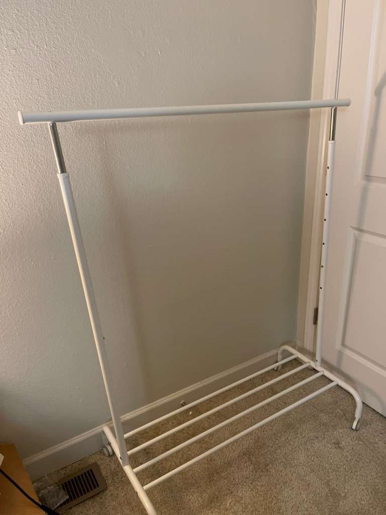 Great condition! Adjustable clothing rack — you can raise or lower the height as you like. Includes a bottom shelf for shoes and easy-to-move wheels. Perfect for bedrooms, closets, or extra storage.