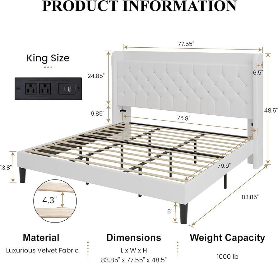 B520 $150 Size King Material Velvet & Metal & Wood Product Dimensions 83.85"L x 77.55"W x 48.5"H Style Modern Special Feature Charging Station, Slat, Squeak Resistant, Storage Shelf, Velvet Color White Built-in Charging Station: This king size bed frame features a built-in charging station with 2 AC outlets, 1 USB port, and 1 Type-C port, allowing you to conveniently charge your devices right by the bed Multifunctional Practical Shelf : The king bed frame with headboard includes a storage shelf for phones, iPads, clocks, and glasses. The headboard is filled with high-density foam, providing a soft and supportive backrest for ultimate relaxation Velvet & Wingback Design: Featuring a velvet upholstered, 48.5" tall wingback headboard, this king bed frame delivers both visual impact and supportive comfort. Recessed edges keep the mattress stable while enhancing the overall design Zero Noise Design: Velcro and EVA strips eliminate slat friction, stopping squeaks. The bed frame king size keeps your mattress from slipping, ensuring a quiet, undisturbed night Sturdy Support: The reinforced king bed includes a central "+" metal support and 12 wooden slats, offering excellent durability with a weight capacity of up to 1000 lbs. The legs are equipped with padded feet for added stability and floor protection Usan1077606-6