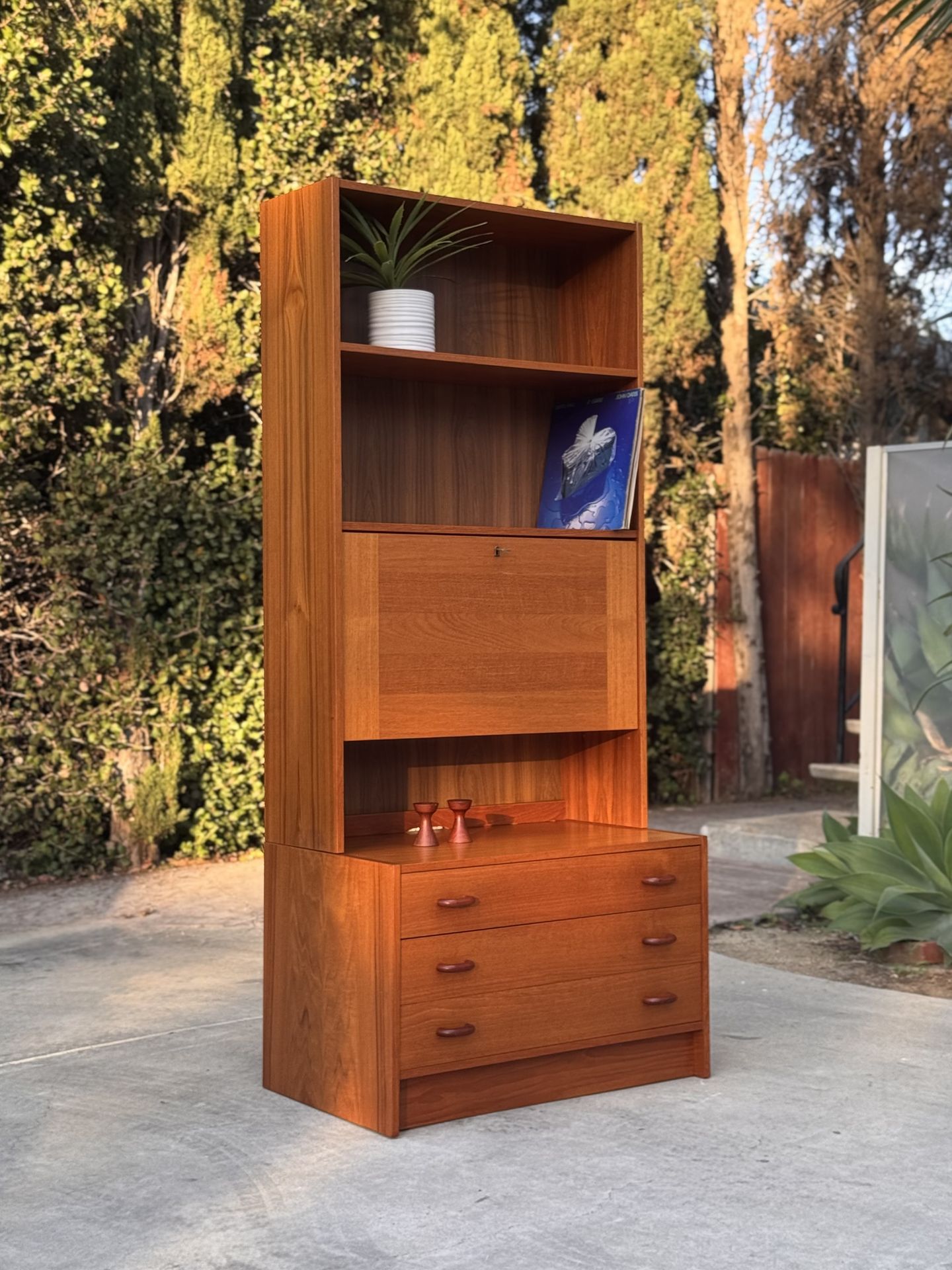Stunning vintage teak wall unit featuring a versatile drop down secretary desk and lower 3 drawer chest. Beautifully crafted with warm, rich teak and a gorgeous wood grain pattern throughout. The lower cabinet includes three smooth sliding drawers, one with the original key and locking function. The upper bookcase offers ample storage with adjustable height shelves. Inside the drop down secretary compartment, you’ll find multiple smaller cubbies and compartments, perfect for organizing mail, office supplies, or collectibles. A perfect blend of form and function with classic Danish modern design. Excellent vintage condition and ready to elevate any living room, office, or bedroom space. 31.25" Wide x 19.25" Bottom Depth x 11.5" Upper Depth x 72.25" Height 🛻 FREE delivery within 10 miles of North Park. Serious inquiries only. Cash only. ~Mid Century Modern wall unit, Danish modern bookcase, vintage teak shelving, Domino Denmark furniture, MCM secretary desk, drop down desk cabinet, teak wall system, Scandinavian modern storage, adjustable shelf bookcase, locking drawer with key, vintage teak cabinet, modular wall unit, 1960s Danish furniture, MCM home office desk, retro teak bookshelf~