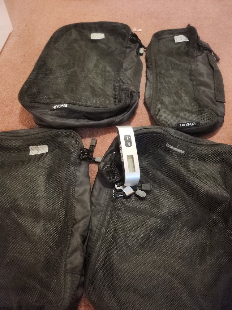 Bagail packing cubes and luggage scale. 6 bags total. 2 LG, 3sm, 1 toiletry bag. Used once.