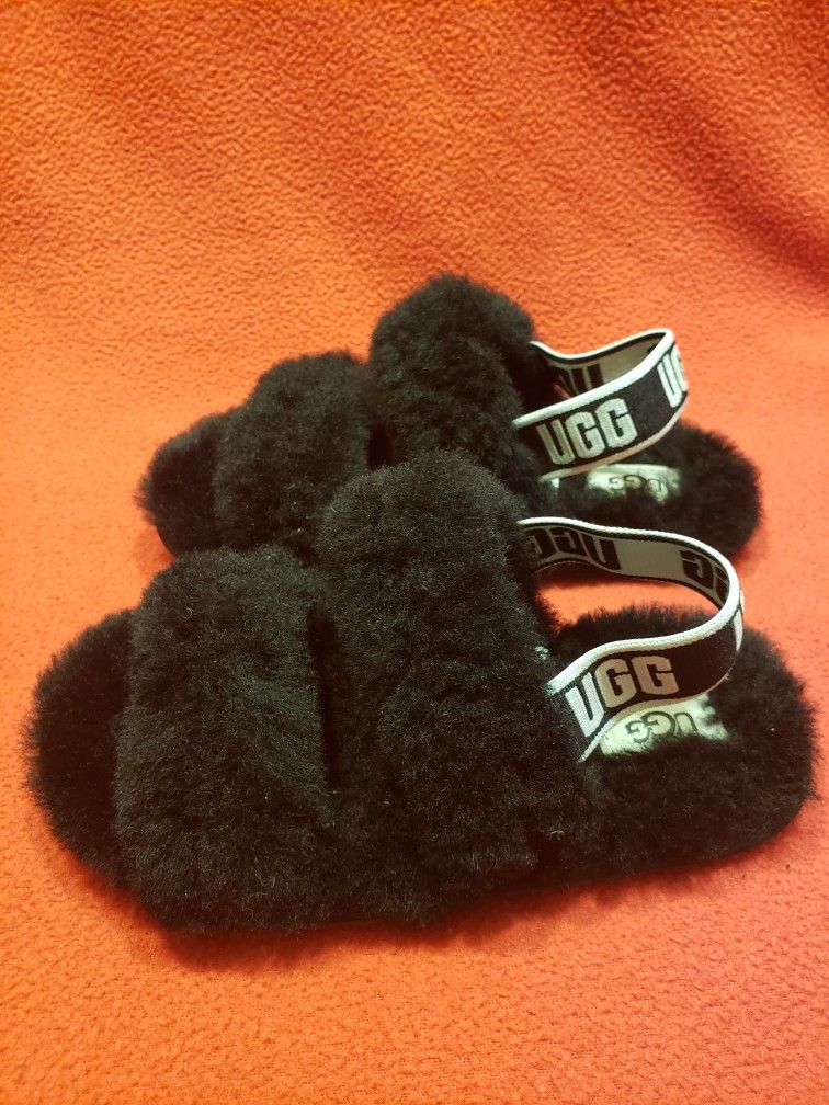 Ugg Fluffy Fuzzy Oh Yeah Double Strap Slipper Slides Kids Size 10 Black Sandals Shoes